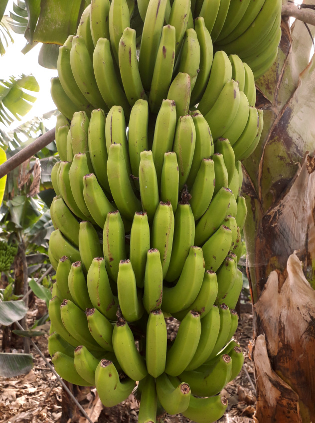 Die Bananenplantagen liegen meist hinter hohen Mauern oder Zäunen. Diese Mauern und die Planen dienen vor allem dem Windschutz, denn die Bananenpflanzen sind sehr windempfindlich. Sie haben nur sehr flache Wurzeln, die nicht mehr als 60cm in den Boden reichen. Man pflanzt vor allem zwei Sorten an. Die „große Zwergin“ hat kräftige, dicke Stämme und fällt nicht so leicht um. Sie wird etwa 3m hoch. Die „kleine Zwergin“ wird nicht ganz so hoch und leichter zu ernten, liefert den höchsten Ertrag, aber die Fruchtstände sind nicht ganz zylindrisch, was etwas höhere Transport- und Verpackungskosten verursacht. Die Ernte ist bei ihr schwieriger, da die Fruchtstände sehr hoch hängen. So ein Fruchtstand kann mehr als 50kg wiegen, und geerntet wird hier von Hand. Gut bewirtschaftete Anlagen können bis zu 60 Tonnen pro ha und Jahr produzieren. Die Sorte Gros-Michel kann acht Meter hoch werden und ist deshalb sehr gefährdet durch starke Winde. Ihr Ertrag ist nur halb so hoch, aber dafür ist sie resistent gegen Nematoden, die größte Ungezieferplage bei den anderen Sorten.