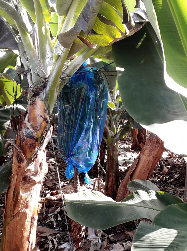 Die Blätter der alten Pflanze lässt man auf der Erde liegen, das verhindert Unkrautbewuchs und Verdunstung. Denn die Banane ist eine sehr durstige Pflanze. Sie bekommt an 4 bis 6 Tagen je Woche jeweils etwa 25 Liter Wasser, das sind 100-150 Liter pro Woche, wohlgemerkt für eine einzige Pflanze! Bei der unfassbar großen Anzahl von Bananenstauden, die es hier gibt, kann man den Wasserbedarf schon fast nicht mehr ausrechnen. (Natürlich wurde die Rechnung schon gemacht, sie kommt auf etwa 20 Mio. Liter pro Hektar und Jahr.) Gleich neben der Kapelle La Consolacion befindet sich ein riesiges Wasserbecken. Jedenfalls ist der Bananenanbau der größte Wasserverbraucher der Insel. Noch dazu ist die Banane sehr hungrig, sie braucht viel Kalium und Stickstoff, der ideale Dünger ist Guano.