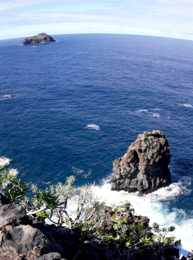 Es lohnt sich noch, ein paar hundert Meter weiter durch El Guincho in Richtung Garachico zu fahren. Dort ist ein toller Aussichtspunkt, der aber seit dem Bau des Umgehungstunnels kaum mehr besucht wird. Auf dem etwas zugewachsenen Weg kann man ein Stück hinunter gehen und steht direkt über den Felsen und dem tosenden Meer. Dort ist auch die „kleine Schwester“ der Felseninsel von Garachico.