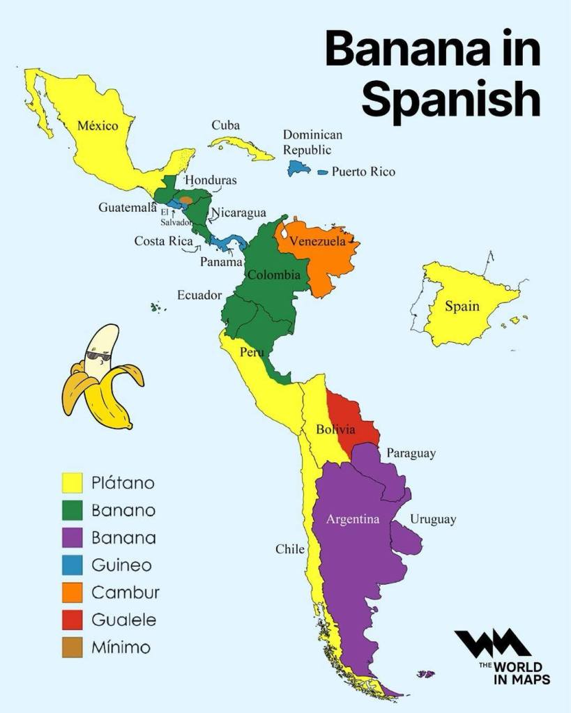 Schon gewusst? In Spanien heißen die Bananen plátanos, aber in weiten Teilen Südamerikas ist auch der Name banana oder banano gebräuchlich. Auf Hispaniola, in Puerto Rico oder Panamá heißen sie guineo und in Venezuela cambur. Aber es gibt noch andere Bezeichnungen.