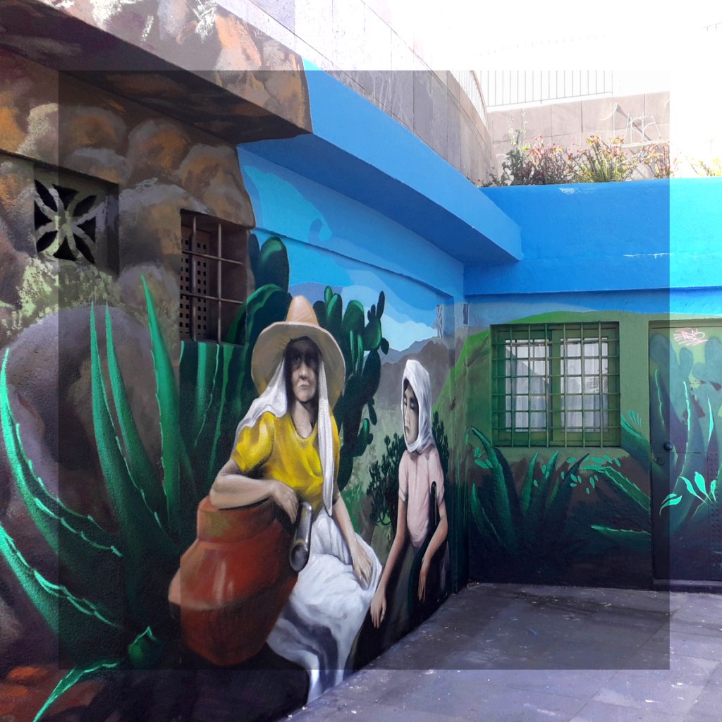 Der verantwortliche Künstler Erik Air bemalte die Wände in kräftigen Farben. Sein Bild enthält auch als vorherrschendes Naturelemente die Pitera, eine Agavenart, und die Chumbera, die Opuntie, Pflanzen, die in dieser Gegend früher vorherrschend waren. An der ehemaligen Bushaltestelle gibt es auch ein Bild in schwarz-weiß, das drei Milchfrauen vor einer „Jardinera“ zeigt, einem der offenen Busse, die hier verkehrten.