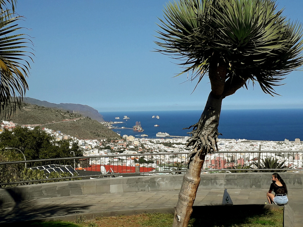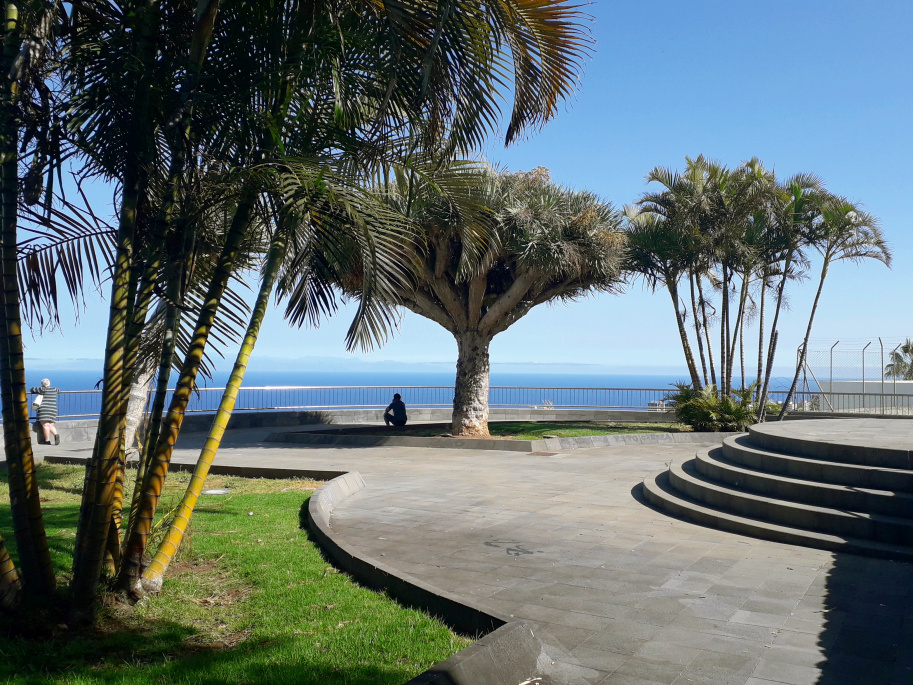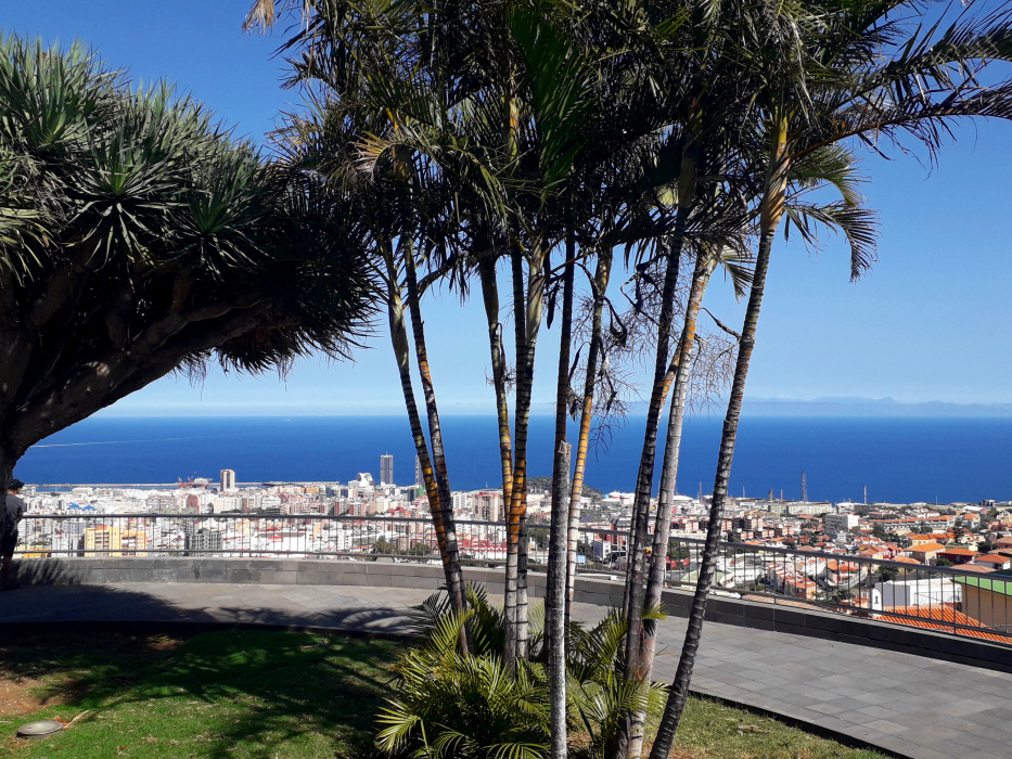 Mit viel Glück findet man an der Straße einen Parkplatz. 100 m weiter oben ist auch eine Haltestelle der Linie 014. Zur Aussichtsterrasse geht es ein paar Treppen hinunter, und schon hat man den besten Blick über die Stadt. Früher gab es hier noch eine Pergola mit steinernen Sitzbänken. Heute sitzt man im Schatten unter mehreren kräftig gewachsenen Drachenbäumen. Das Panorama ist beeindruckend und reicht über den Hafen weit nach Norden.