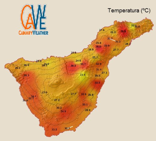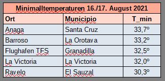 Auch die nächtlichen Minimaltemperaturen lagen vielerorts deutlich über 30º, selbst auf der Nordseite der Insel. Die heißeste Nacht aller Zeiten erlebte Puntagorda im Nordwesten La Palmas mit einem Minimum von 37,6º.