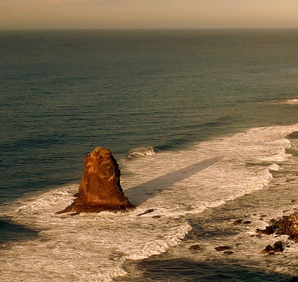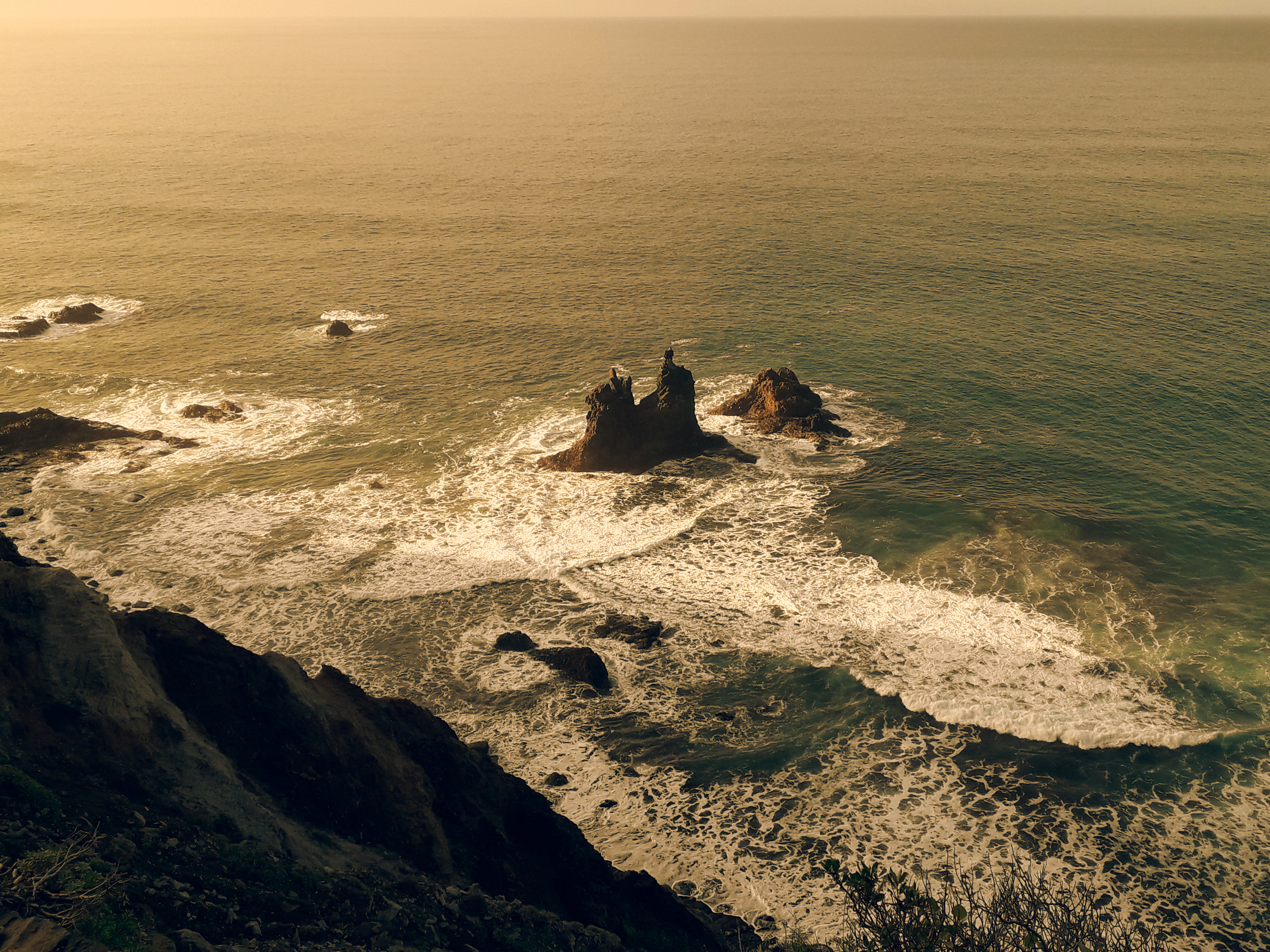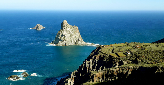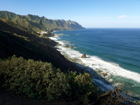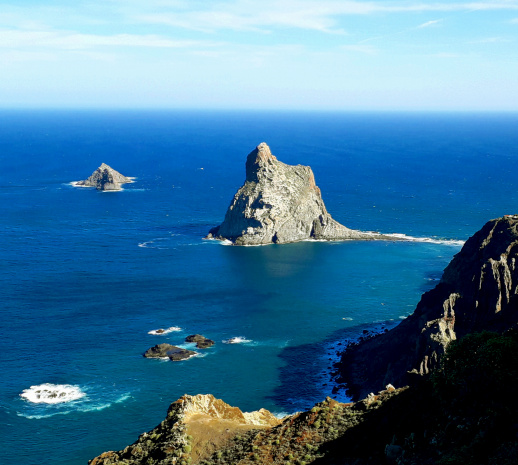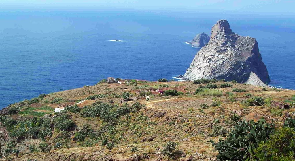Nach weiteren 30 Minuten erreicht man die höchste Stelle des Wegs. Von dort hat man einen wundervollen Blick zu den berühmten Felsen von Anaga, die als besondere Schutzzone ausgewiesen sind und nicht betreten werden dürfen. Der steil aufragende, 180m hohe Roque de Tierra liegt näher an der Küste, der niedrigere Roque de Fuera ist etwa 800m entfernt. Beide sind Reste von ehemaligen Vulkanschloten, die durch die Erosion freigelegt wurden, wie viele der anderen Felstürme an der nördlichen Anaga-Küste. Die Roques sind Rückzugsgebiete vieler Seevögel, und es gibt dort sogar eine Eidechsenart, die als Subspezies Gallotia gallotia insulanagae nur dort vorkommt. Zum Glück für die Natur ist dieser Küstenabschnitt für die Schifffahrt äußerst gefährlich.