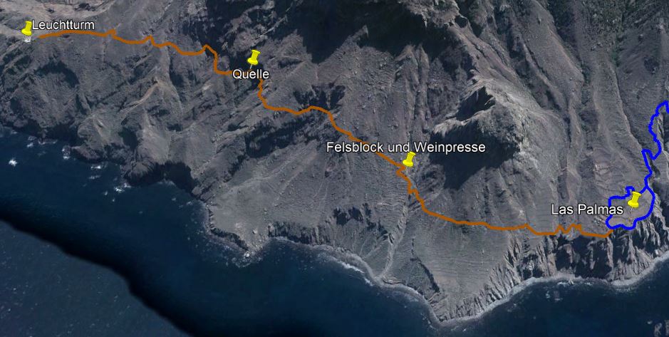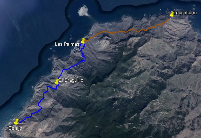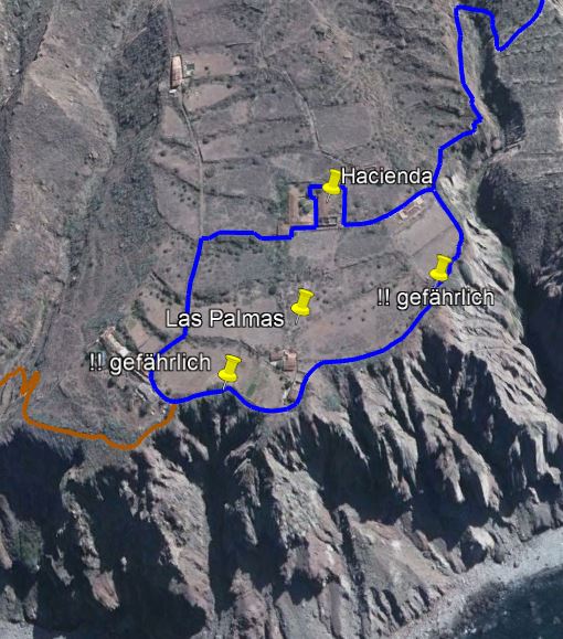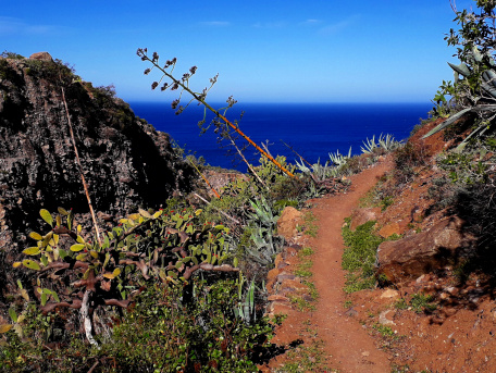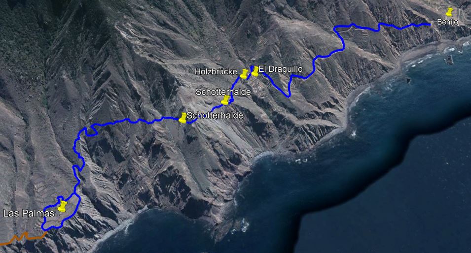 Dort beginnt der Wanderweg nach Las Palmas. Menschen mit Höhenangst oder Schwindelgefühlen sollten die Wanderung nicht machen. Die gesamte Strecke verläuft im Steilhang mit freiem Blick zum 200m tiefer gelegenen Meer. Gleich nach einer kleinen Holzbrücke geht es bergauf, und wenn das Dorf El Draguillo aus dem Blickfeld verschwindet, muss man zwei steile Schotterhalden überqueren. Auf diesen Passagen ist besondere Vorsicht angesagt! Der Weg ist breit, aber man darf nicht daneben treten, denn bei einem Sturz gibt es nach unten keinerlei Halt mehr.