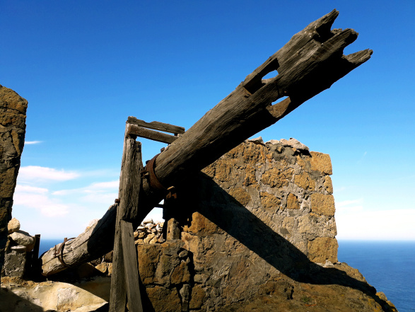 Ein Highlight ist eine alte Ruine unter einem gewaltigen, überhängenden Felsblock. Dort haben einmal Bauern gewohnt. Direkt über diesem Felsen entdeckt man die Reste einer Weinpresse. Das Becken wurde direkt in den Fels gehauen und der gewaltige Holzbalken ragt in den Himmel. Unglaublich, dass selbst in dieser unwirtlichen Gegend einmal Wein angebaut wurde. Welchen Wert musste der Wein im 17. Jahrhundert gehabt haben!