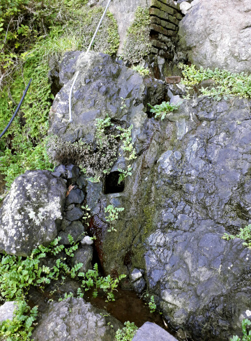 Danach geht es weiter steil bergauf, bis sich der Weg auf etwa 250m Meereshöhe etwas verflacht. Es gibt einige Stellen, die besonders rutschig sind. Vorsicht! Immer wieder kommt man nah an die Felsen heran. Interessant ist die Quelle von Junquillo, wo direkt unter einer Felswand Wasser austritt. Es wurde in einem Becken aufgefangen und tröpfelt in einen kleinen Hohlraum. Daneben sieht man auch noch eine in den Stein gehauene Tränke. Diese Quelle versorgte früher auch über eine einen Kilometer lange Leitung den Leuchtturm, bzw. seine Bewohner, mit Wasser.