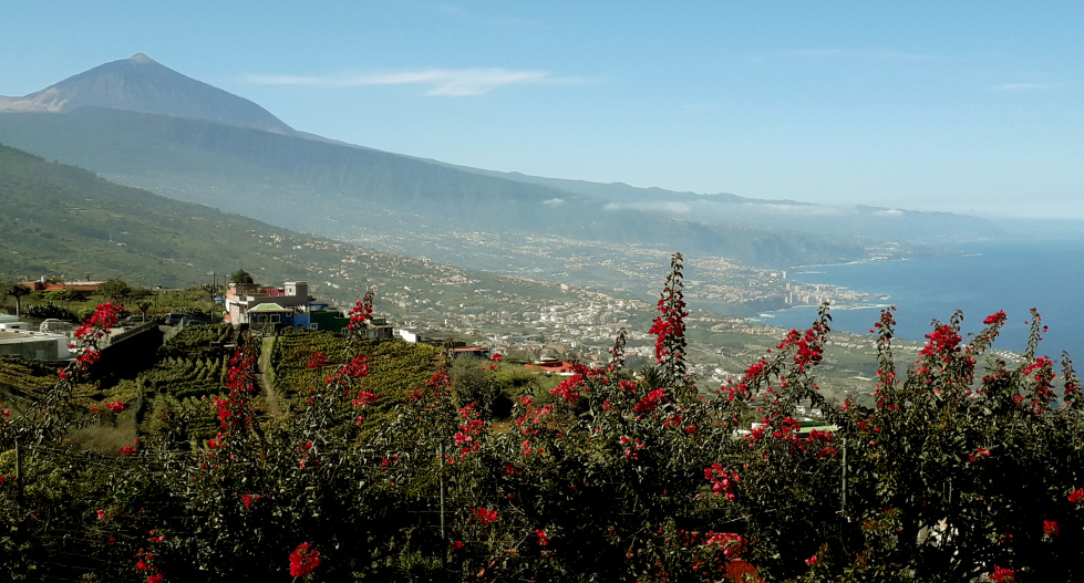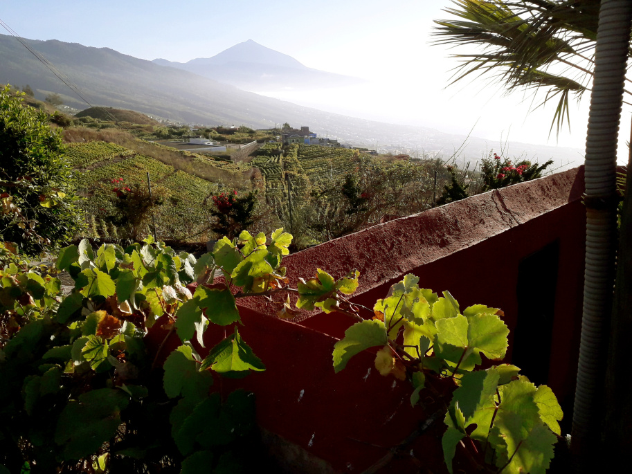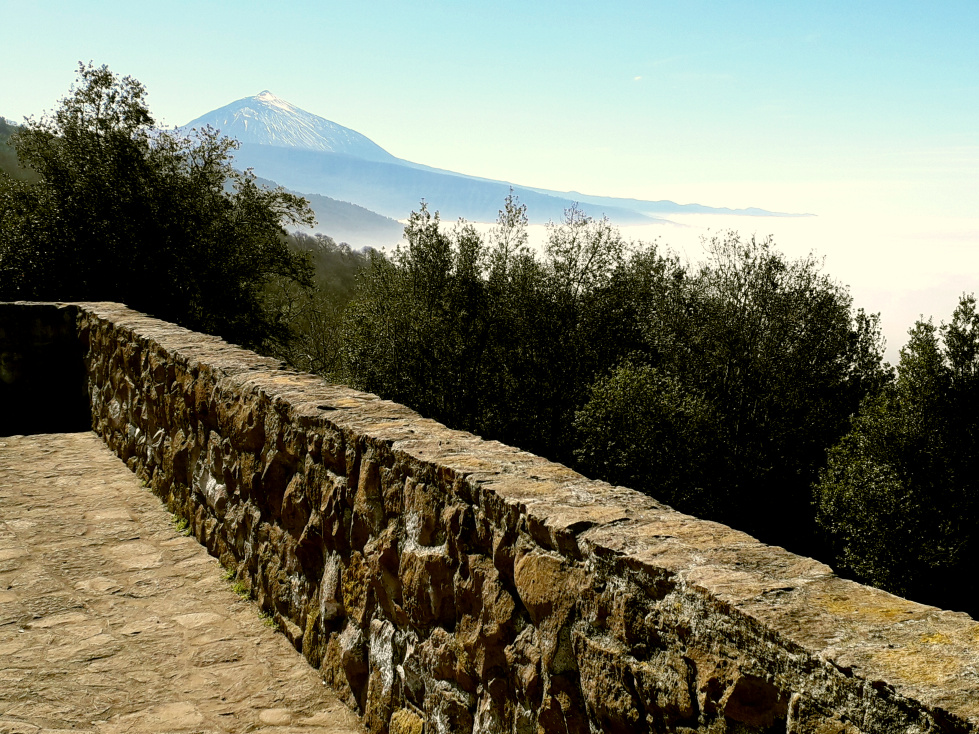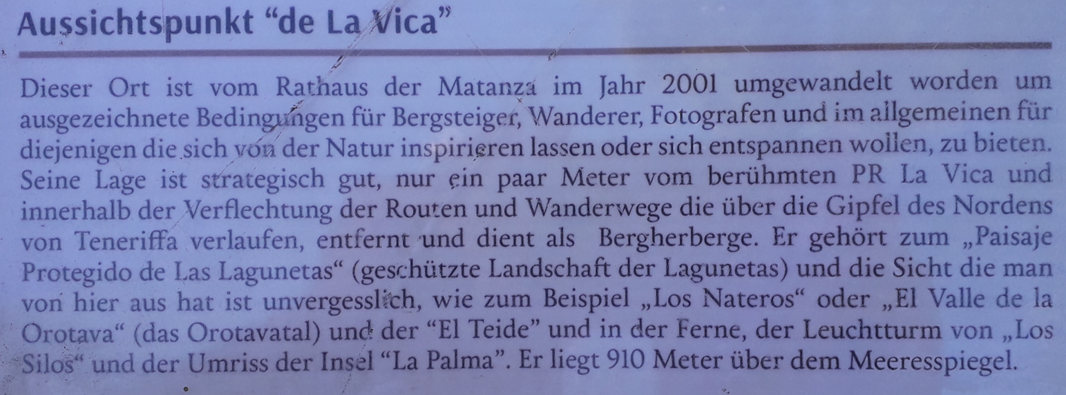 Das Sträßchen geht nun weiter steil bergauf zum Weiler La Vica und trifft auf die Fahrstraße. Nach links durchquert man das Dorf und geht an der Kreuzung gerade aus weiter. Auf der Straße kommt man nach etwa einem Kilometer zum Aussichtspunkt La Vica. Die Aussicht Richtung La Matanza ist leider fast ganz durch Bäume versperrt, aber Richtung Westen hat man einen schönen Blick zum Teide. Auf der Info-Tafel ist auch beschrieben, dass man das Orotavatal sehen könne, aber davon sieht man wirklich nicht viel. Und der Blick bis zum Leuchtturm von Los Silos oder nach Palma dürfte nur selten möglich sein.