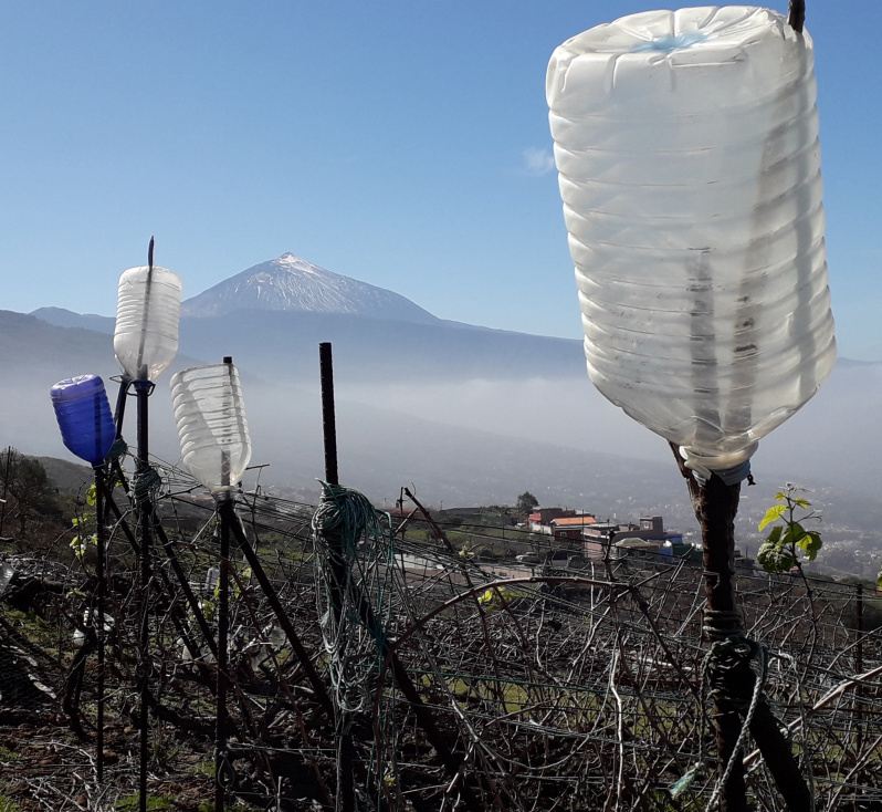 Wer den Berg Nr. 2 umrunden will, muss einen etwas anstrengenderen Weg machen. Wenige Meter, nachdem man vom Wanderpfad wieder auf die Straße gekommen ist, zweigt rechts ein betonierter Fahrweg ab, der am Hang in einer Rechtskurve langsam aufsteigt. Von der Höhe hat man einen schönen Blick hinunter nach La Matanza. In der Ferne grüßt der Teide.