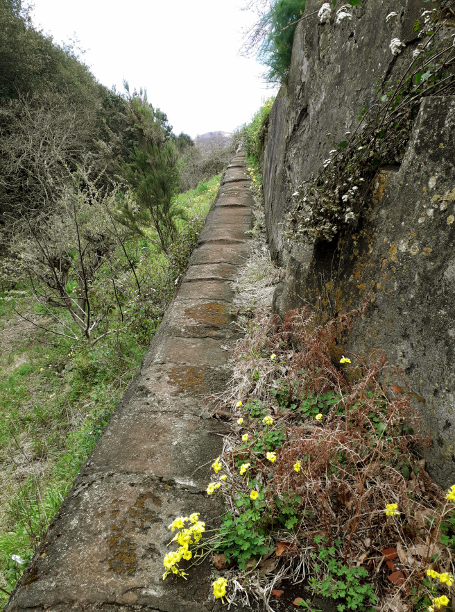 400m weiter (nach Verlassen der Betonpiste) trifft man auf einen Wasserkanal, der in einem Bogen das Tal überquert. Dahinter geht es nicht mehr weiter. Aber man kann nach links auf den Kanal gehen. Vorsicht, er ist an einigen Stellen etwas zugewachsen. Nach 70m verschwindet der Kanal unter der Erde, dort kann man kurz hinauf klettern zu dem schmalen Sträßchen. Es handelt sich wieder um dasselbe, das unten eine Betonpiste war. (*-Variante, siehe grün in der Karte).