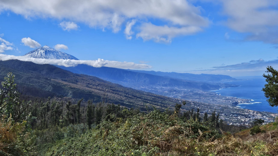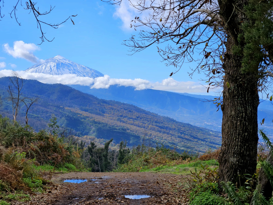 Das Sträßchen geht nun weiter steil bergauf zum Weiler La Vica und trifft auf die Fahrstraße. Nach links durchquert man das Dorf und geht an der Kreuzung gerade aus weiter. Auf der Straße kommt man nach etwa einem Kilometer zum Aussichtspunkt La Vica. Die Aussicht Richtung La Matanza ist leider fast ganz durch Bäume versperrt, aber Richtung Westen hat man einen schönen Blick zum Teide. Auf der Info-Tafel ist auch beschrieben, dass man das Orotavatal sehen könne, davon konnte man aber lange nicht viel sehen. Nach dem
