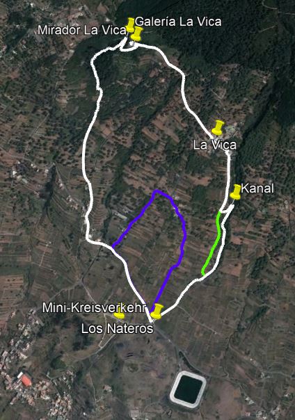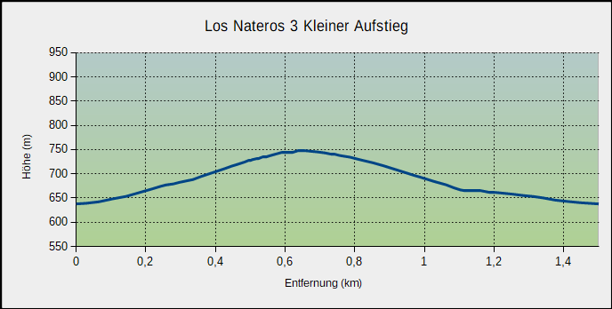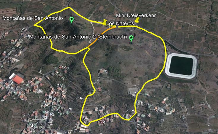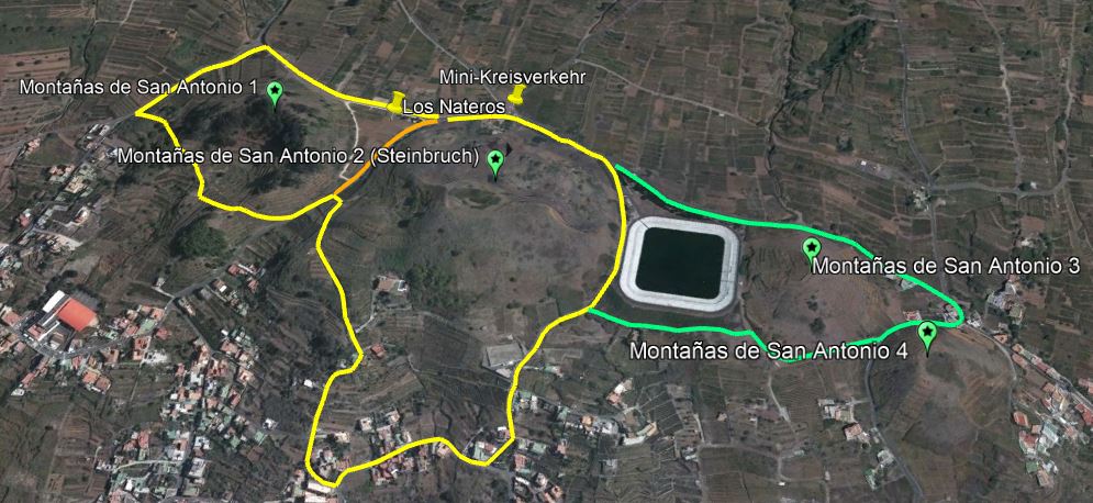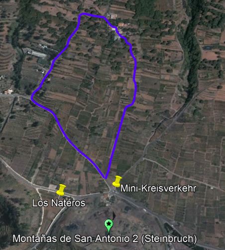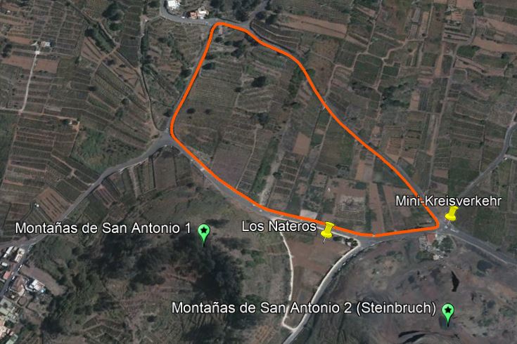Von Los Nateros geht man Richtung Osten auf der Calle Real Orotava und auf der Joggingstrecke, am Fuß des Bergs Nr. 1 entlang. Die Straße biegt nach links, und bevor man zum ersten Haus kommt, entdeckt man einen Pfosten, an dem früher vielleicht mal ein Schild war. Dort gehen nach links ein paar betonierte Stufen hinauf. Die grün-weiße Farbmarkierung an der Mauer ist stark verblasst. Es beginnt ein Wanderweg, der etwas steinig ist und neben den Weinfeldern leicht ansteigt. Oben geht es durch eine Senke und bald wieder hinunter zur Straße. Nach links käme man in wenigen Minuten wieder zurück nach Los Nateros (Abkürzung = orange, gesamt 1,2km).