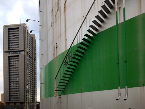 Hinter dem Tank stand ein luxuriöses Business-Hotel, dessen transparente Aufzüge wie Kolben einer gigantischen Glasmaschine auf und ab fuhren. Es existiert nicht mehr, da niemand die gigantische Rechnung bezahlt hatte, die während der Dreharbeiten entstanden war.