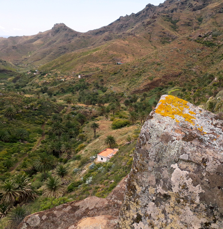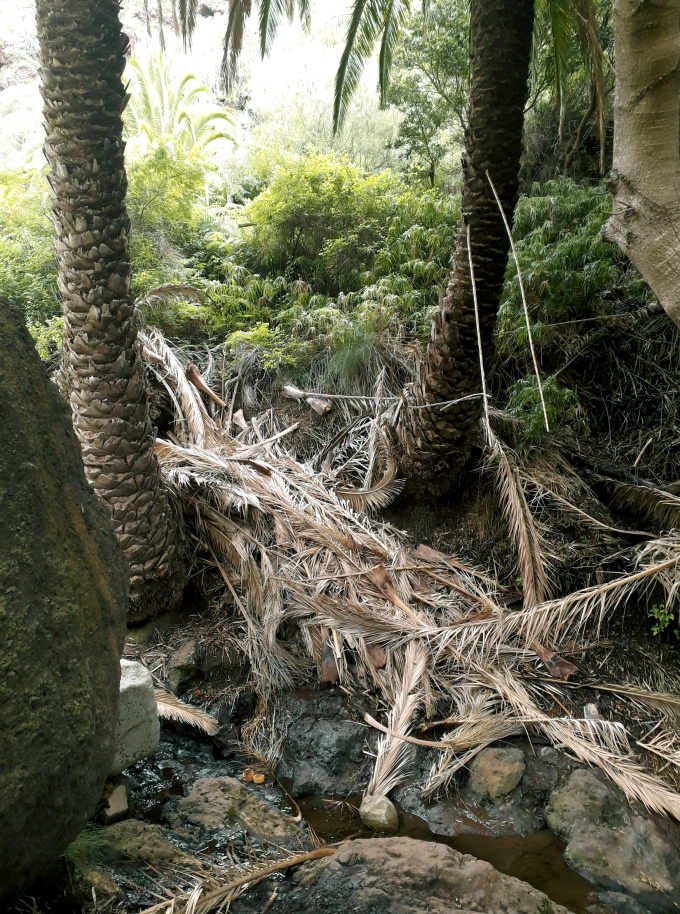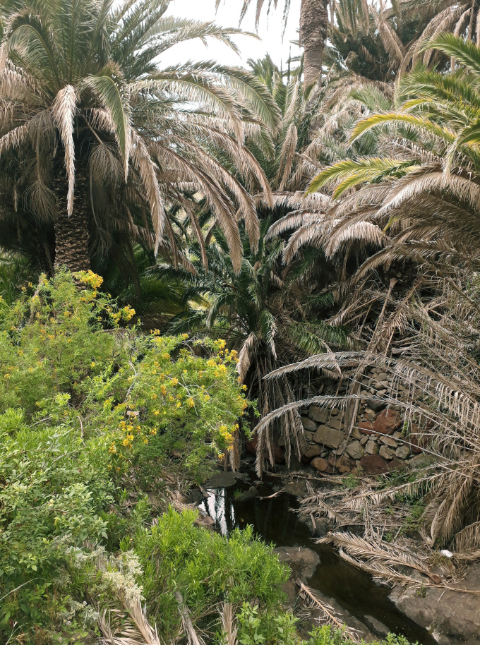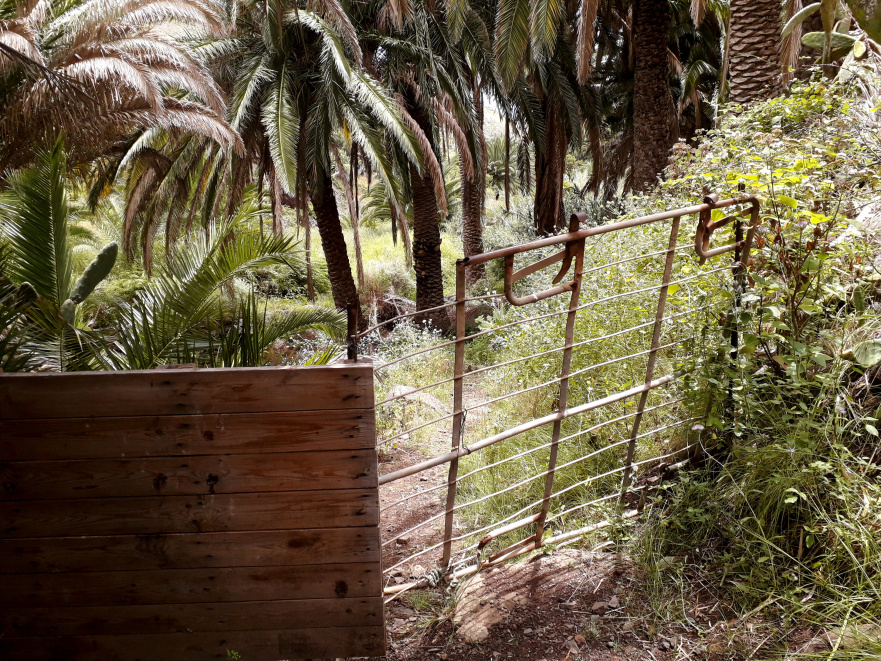 Geradeaus weiter beginnt ein Wanderweg, der zuerst über ein paar Felsen hinweg geht, und dann bequem talaufwärts verläuft. Hier sieht man schon im Talgrund eine große Ansammlung von Palmen. Es sind kanarische Dattelpalmen. Die phoenix canariensis ist neben dem Drachenbaum ein wichtiger Symbolbaum der Inseln. Sie gehört zu den Federpalmen (im Gegensatz zu den Fächerpalmen) und ist leicht an zwei Merkmalen erkennbar: Sie hat immer einen unverzweigten, geraden Stamm und dieser hat rhombenförmige Narben, die beim Abfallen der Blätter entstehen. Die kleinen Früchte haben nur ganz wenig Fruchtfleisch, sie sind zwar essbar, werden aber nur als Viehfutter verwendet.