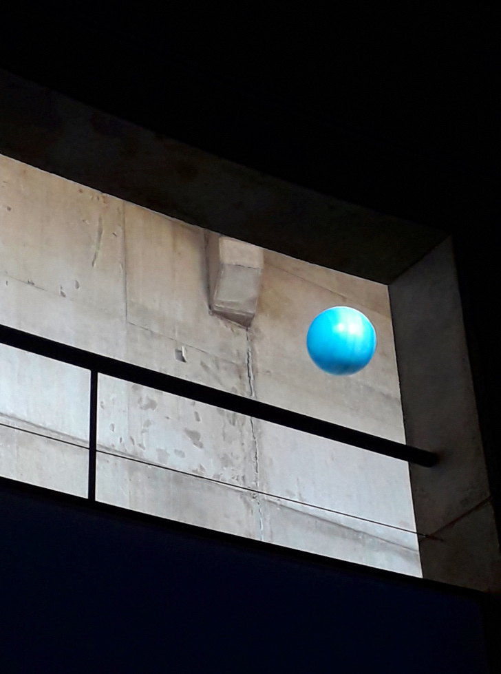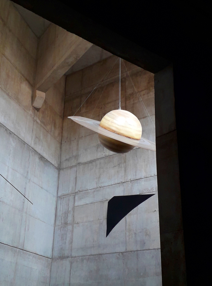 Gleich über der breiten Eingangstreppe hängen die Planeten in ihrer relativen Größe. Eines der kleinen Kügelchen ist die Erde.