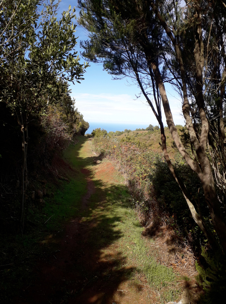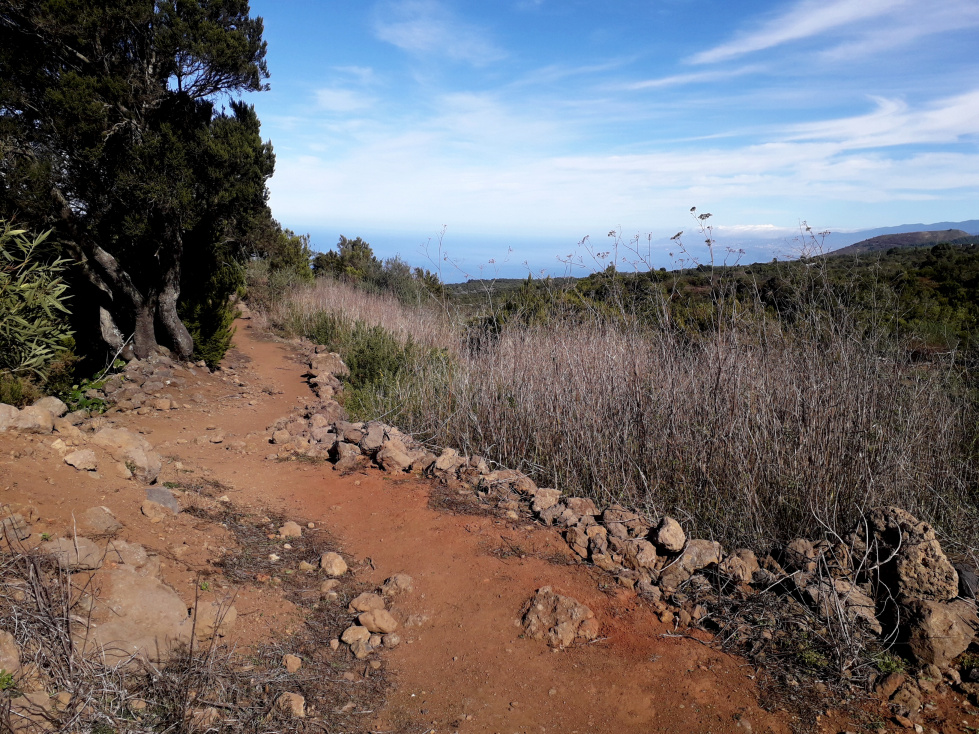 Weiter folgt man nun dem ebenen Weg vor der Kapelle und kommt gleich an vier Kreuzen vorbei. Das schmale Sträßchen schwenkt nach 500m nach links. Dort geht man geradeaus auf einem Wanderweg weiter, der auf einem kleinen Höhenrücken verläuft. Hier eröffnet sich ein schönes Panorama über die Nordküste und natürlich zum Teide.