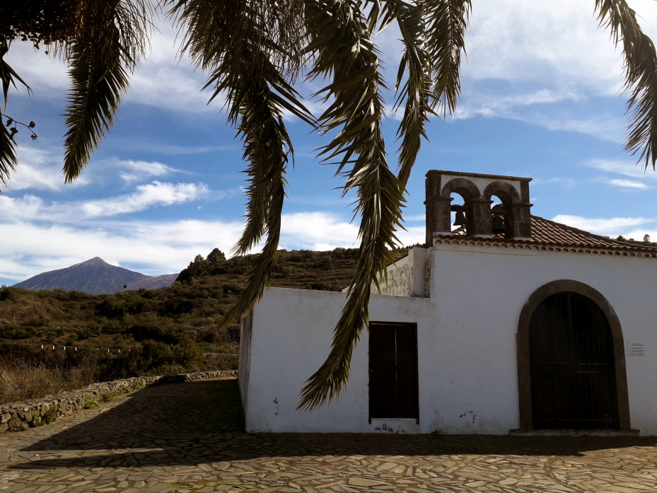Dort steht mitten in den Feldern die Kapelle von San José, ein beschaulicher Ort zum Ausruhen. Vor der Ermita gibt es einen kleinen Platz mit einer Palme. Bei schönem Wetter hat man einen Blick zum Teide.