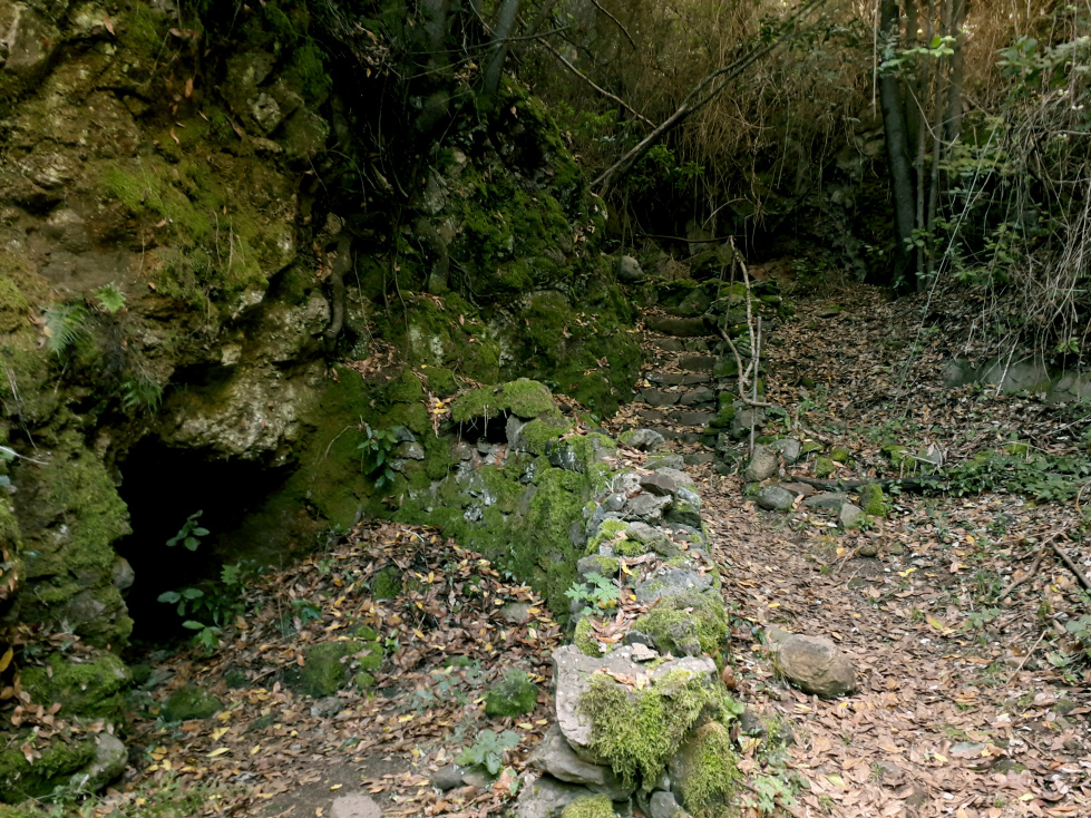 Unvermittelt taucht der Weg dann in den grünen und feuchten Mischwald ein, und es geht etwas steiler bergab. Nach dem Regen könnte es hier etwas rutschig sein. Unten trifft man wieder auf einen beschilderten Wanderweg. Es ist die Ruta del Agua, bezeichnet als SL TF 151.1. Nach wenigen Metern kommt man an einem verlassenen Wasserstollen vorbei, und dann geht es hinein in die dunkle Schlucht des Geiers.