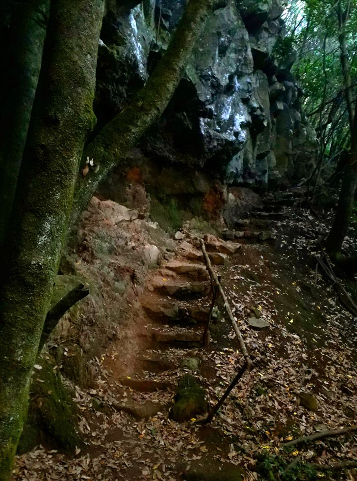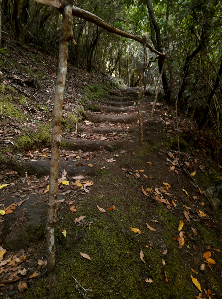 Ein Stück weiter oben kommt man zu einem gewaltigen überhängenden Felsblock. Vielleicht hatte dort einmal ein Guirre sein verstecktes Nest gebaut. Nun geht es auf mehreren in den Fels gehauenen Treppen aufwärts, aber zum Glück schön im Schatten. Erst ganz oben, wenn man aus dem Wald herauskommt, weiß man das zu schätzen. Danach geht es noch ein Stück zwischen den Feldern weiter und man kommt schnell zur Umgehungsstraße von San José de los Llanos.