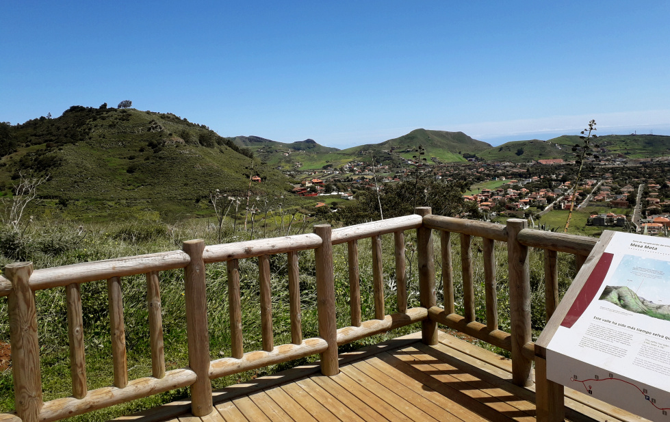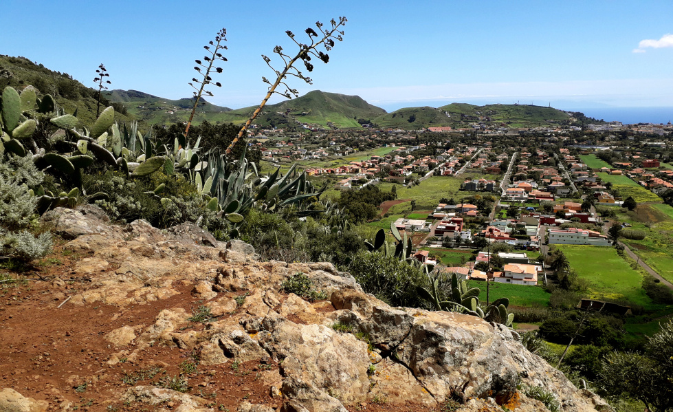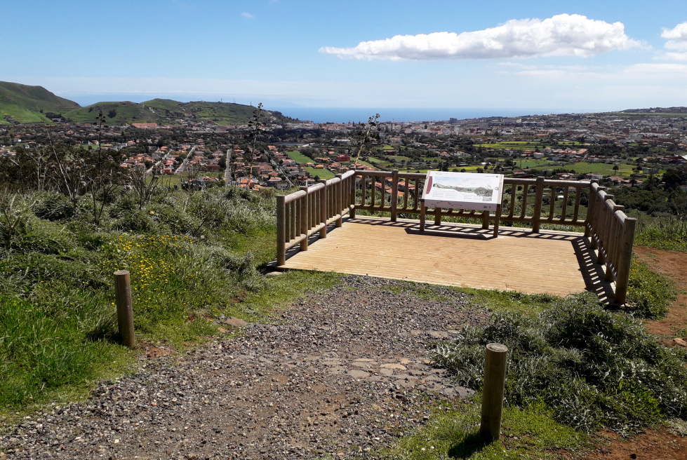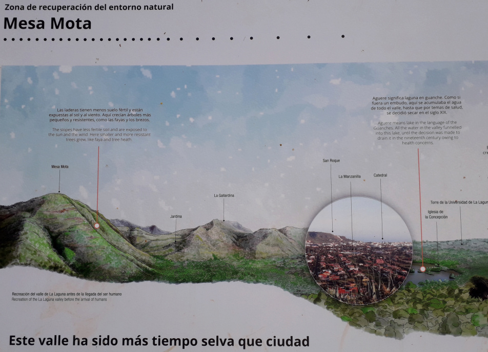 Von hier aus hat man schon einen schönen Blick über La Laguna und hinüber zur Mesa Mota. Aber es wird noch besser. Der Weg vom Parkplatz aus endet nach etwa einem Kilometer (natürlich könnte man dort weiter den Berg hinauf gehen). Kurz vorher zweigt nach links ein Weg ab zu einer Aussichtsterrasse, wo man den perfekten Blick auf die Vega von La Laguna hat. Diese Ebene war vor der Gründung der Stadt ein Urwald und ein Sumpfgebiet.
