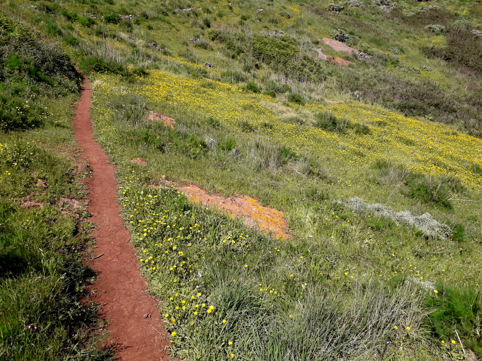 Direkt unterhalb der Terrasse beginnt nach links ein schmaler Pfad, auf dem man zurück gehen kann. Wenn man nicht so gut zu Fuß ist, oder wenn der Boden sehr feucht ist, sollte man lieber auf dem Schotterweg zurück gehen. Der Pfad geht etwas auf und ab, und manchmal sind auch ein paar felsige Stellen zu überwinden, aber dort kommt man wirklich in die Blumenwiesen hinein.