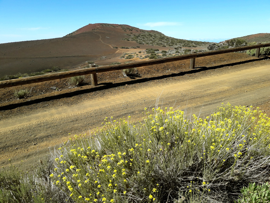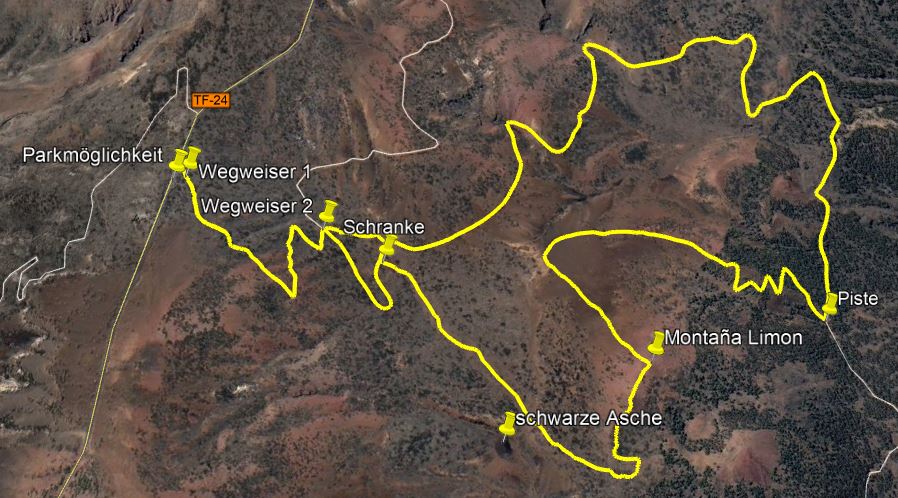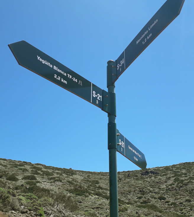 Seltsam ist die Wanderung auch: Man muss nämlich zum Berg hinunter steigen. Man beginnt am besten direkt an der TF-24, etwa bei Kilometer 34,5, in der Nähe der „Piedras del mal abrigo“, es gibt an der Straße eine Parkmöglichkeit, dort wo der offizielle Weg S 21 in die Straße mündet. Wenige Meter unterhalb entdeckt man einen Wegweiser, und dort beginnt der Pfad zur Montaña Limón. Dieser steigt langsam am Hang entlang ab und trifft nach mehreren Zickzack-Kurven, etwa nach 15 Minuten, auf eine Piste. Hier steht wieder ein Wegweiser in Richtung Montaña Limón.
