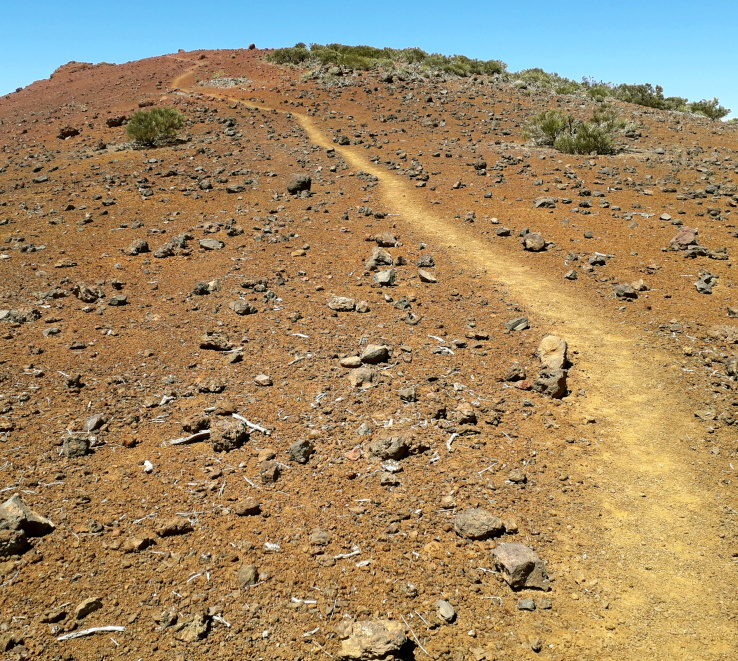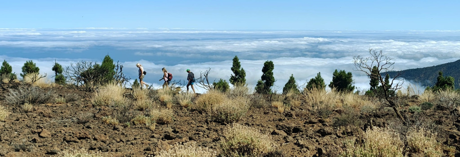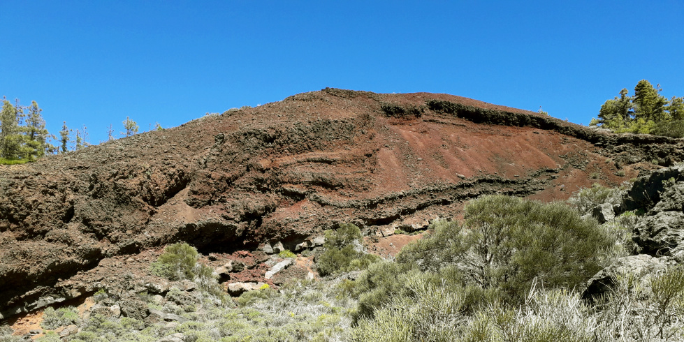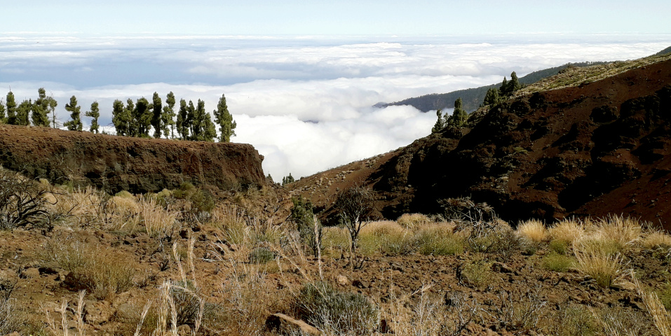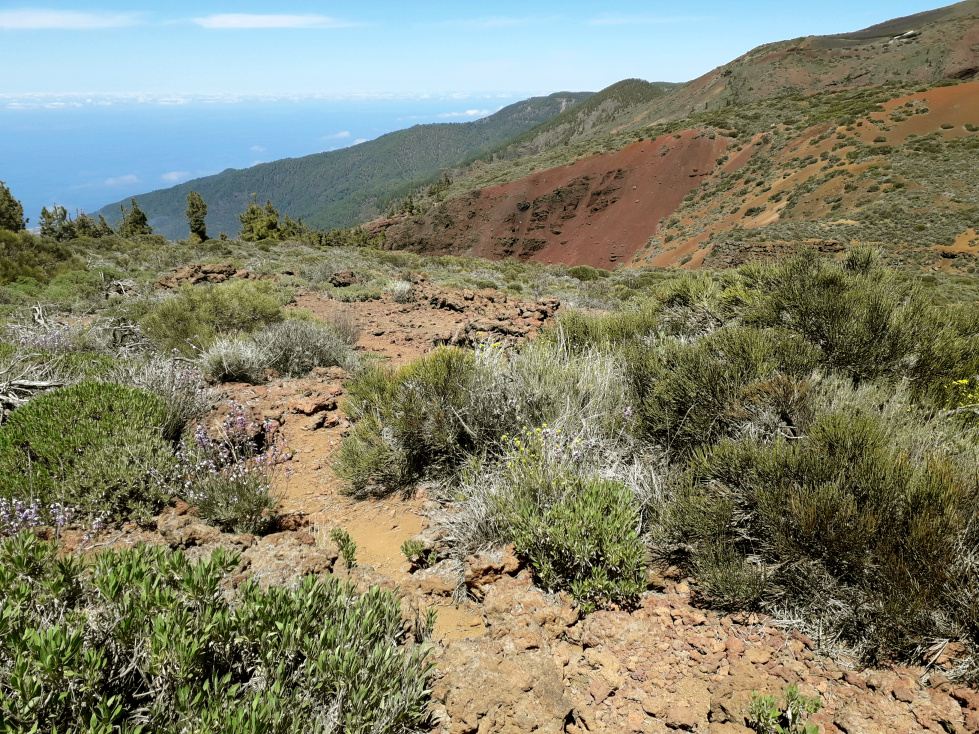 Man bleibt auf der linken Seite oberhalb des Tals. Jetzt gibt es keinen Weg mehr! Am Hang entlang hält man sich links aufwärts und geht über Lavafelsen, durch niedriges Gebüsch und über Stock und Stein langsam bergauf. Wenn die Spitzen einiger Kiefern sichtbar werden, steigt man nach links etwas steiler aufwärts bis zu einer Verebnung. Dort ist auch wieder ein erkennbarer Weg, der in Richtung der Montaña Limón aufsteigt.