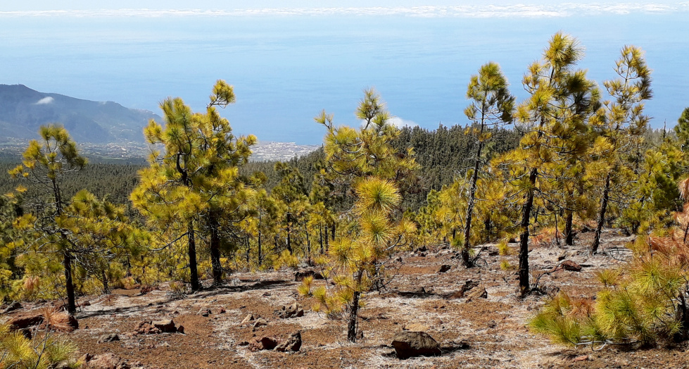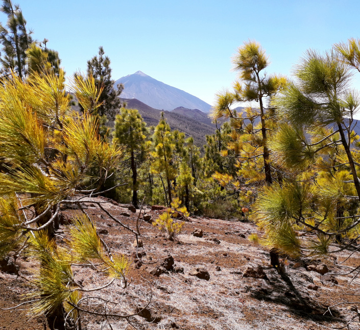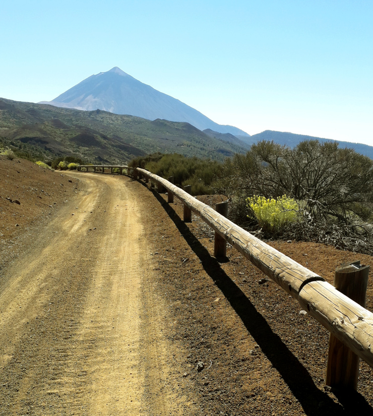 Der Abstieg erfolgt auf dem Aschefeld bis zum Wanderweg S 34, der Richtung Waldrand langsam abwärts führt. Im Wald geht es in mehreren Kurven etwas steiler abwärts. Immer wieder hat man Ausblicke zum Teide und ins Tal. Der Weg trifft nach rund 10 Minuten im Wald auf eine Piste. Es ist dieselbe, die man oben schon gequert hat. Auf ihr geht es nach links ganz gemächlich wieder aufwärts. Die Piste ist ziemlich staubig.