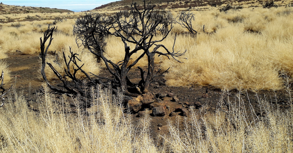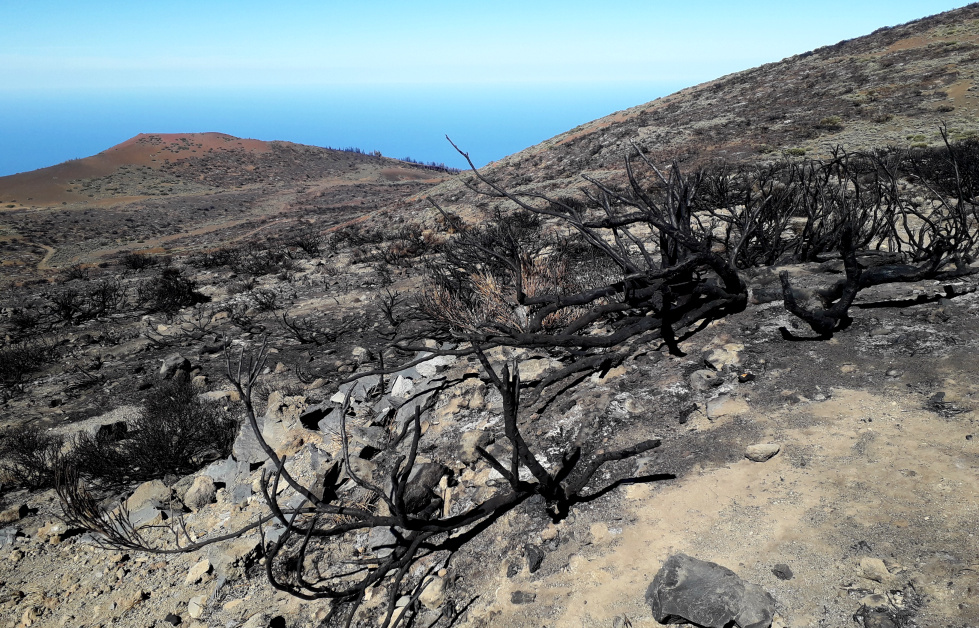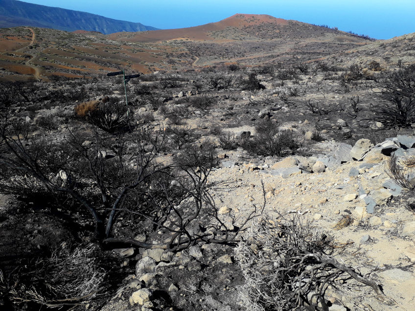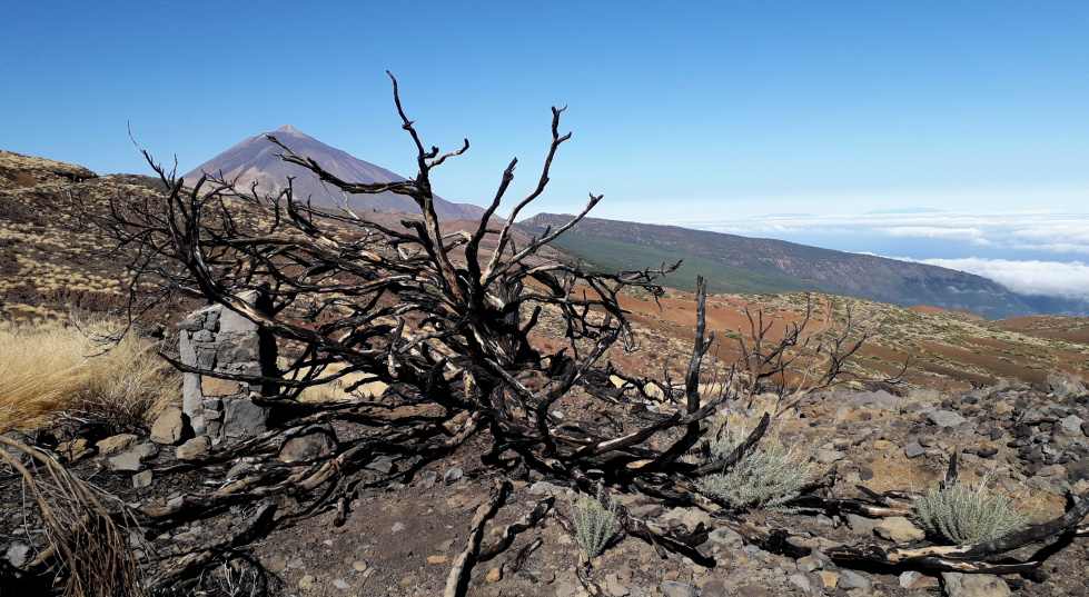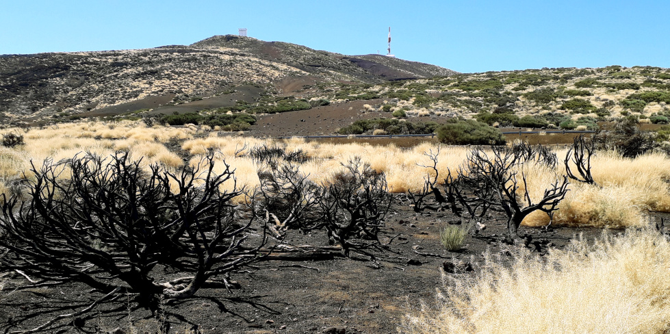Nach dem schweren Waldbrand im August 2023 hat sich die Landschaft am Fuße der Montaña Limón stark verändert. Die grünen Büsche des Teideginsters sind komplett verbrannt und wurden zu schwarzen Ruinen. Sie werden sich nie wieder erholen. Im Sommer bietet sich ein gespenstisches Bild. So sah es drei Monate nach dem Brand aus.