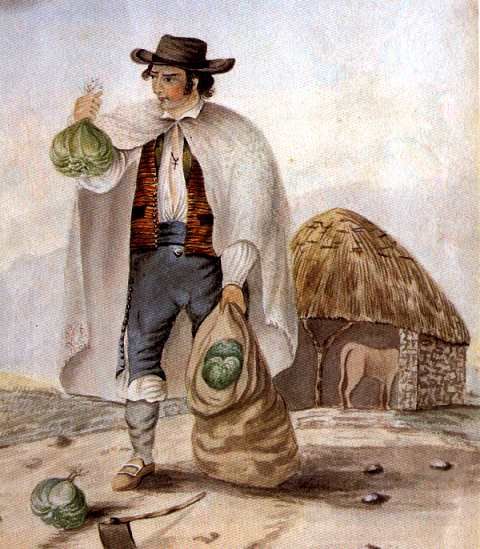 In einem Text von Alfred Diston, der die Zeichnung „Man of Tacoronte“ aus seinem Album (Costumes of The Canary Islands, London, 1826) begleitet, heißt es: „Der auffälligste Teil seiner Kleidung besteht aus einer englischen Decke, die über ein Stück Seil gefaltet ist, das ihm um den Hals gebunden ist. Dieser bildet einen Mantel, der ihn vor den ergiebigen Regenfällen schützt, die auf den hochgelegenen Boden fallen, auf dem er lebt, und darin eingewickelt verbringt er die Nacht, ohne sich auszuziehen, auf dem Lehmboden seiner armseligen Hütte oder auf einem Bett aus Stroh. Von allen nach Teneriffa eingeführten Decken wird nicht einmal ein Viertel zum Beziehen der Betten verwendet, fast alle Bauern tragen sie so wie hier abgebildet“.