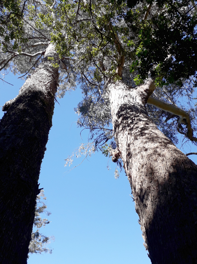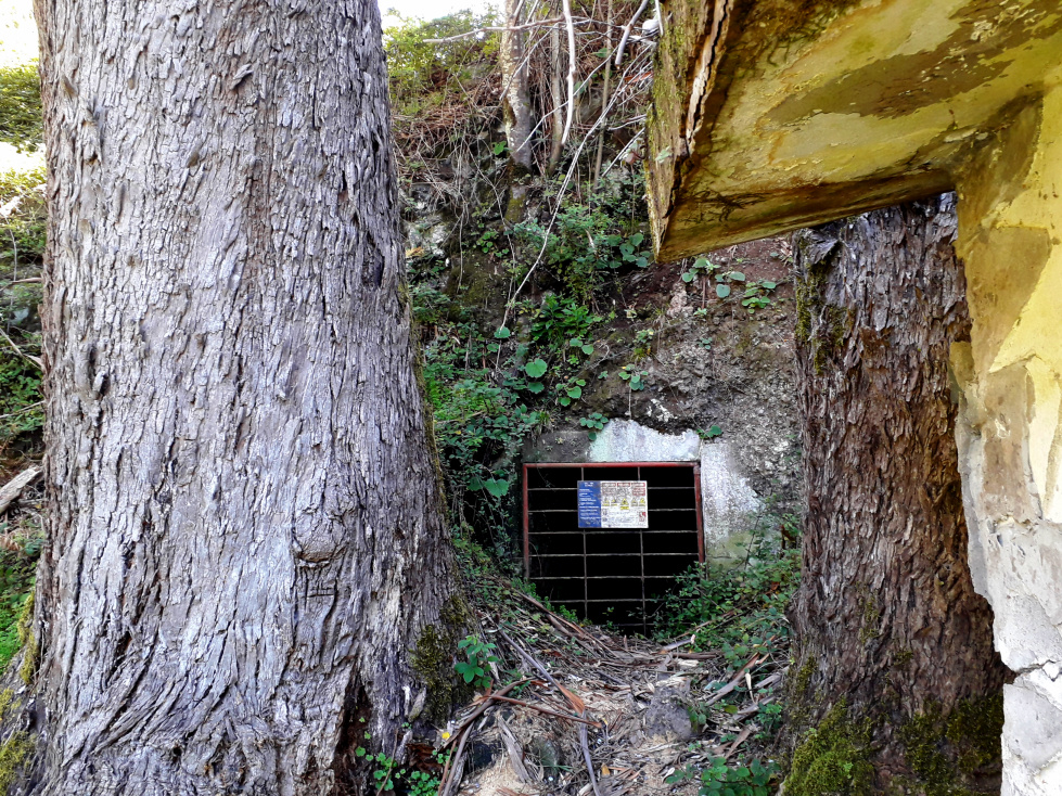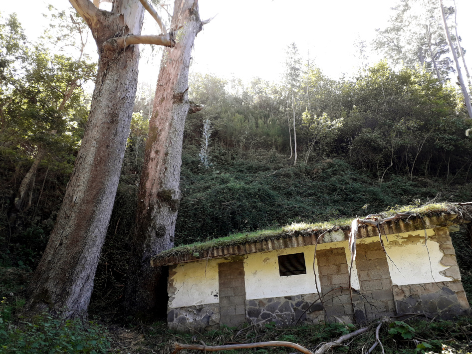 Variante 1 (siehe unten) würde bequem auf der Straße wieder in den Wald hinein gehen. Aber es lohnt sich abermals, noch ein besonderes Highlight mitzunehmen. Direkt unterhalb der Aussichtsterrasse (nicht nach rechts die Treppen hinunter!) knickt ein Weg scharf ab und führt hinunter zum Wasserstollen von La Vica. Dort steht der alte Arbeitsschuppen, völlig von der Vegetation überwuchert. Daneben bewundert man zwei riesige Eukalyptusbäume, vielleicht sind es die größten der ganzen Insel. Der Stollen ist 800m lang und hat drei Verzweigungen.