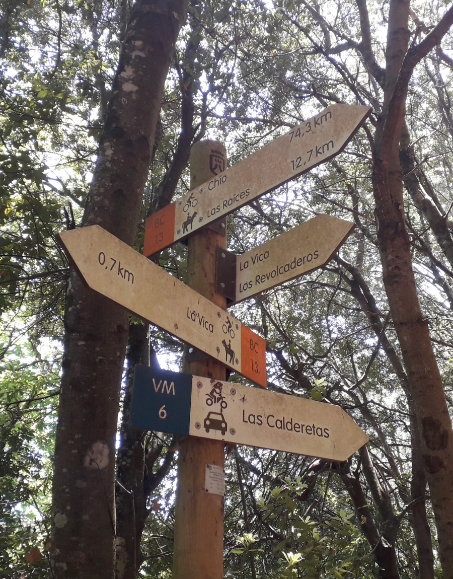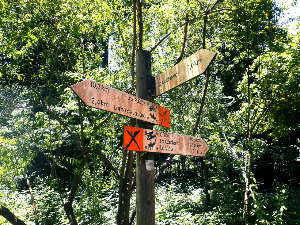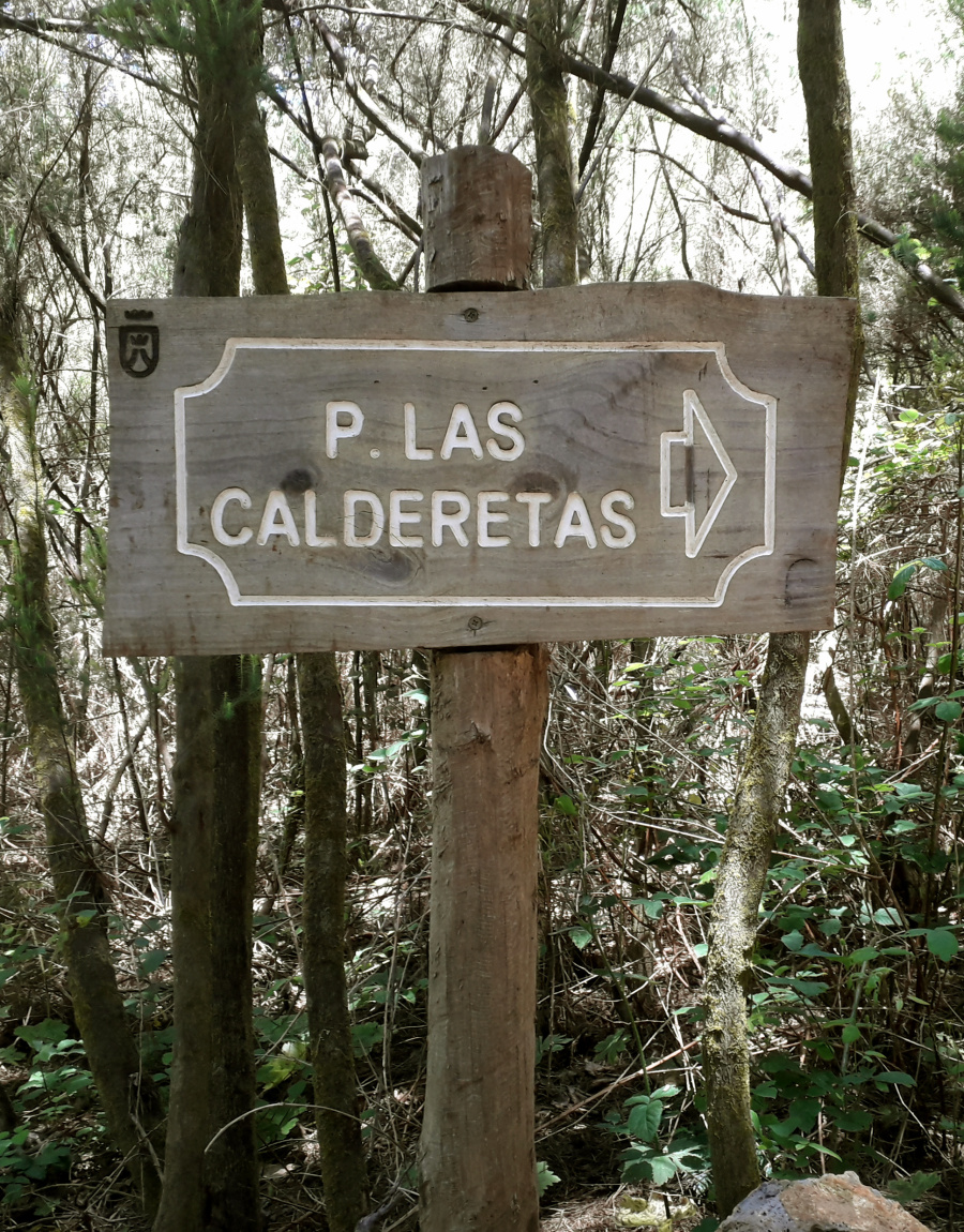 Nach links und mit schönem Blick ins Tal geht es nun eben am Waldrand entlang. Das Ziel Las Calderetas ist mehrfach ausgeschildert (BC 1.2). Nach 500m gibt es einen scharfen Linksbogen. Nach weiteren 600m schwenkt die Piste leicht nach links. Dort kann man geradeaus auf einem Wanderpfad in den Wald hineingehen. Er trifft nach 250m wieder auf die Piste, und man hat sich einen großen Bogen erspart. Nun sind es keine 15 Minuten mehr bis zum Picknickplatz Las Calderetas.