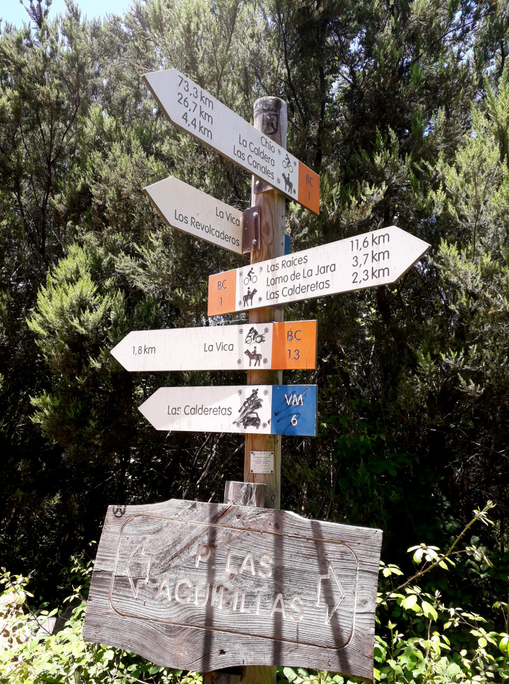 Etwas mehr als 2km bleibt man nun immer auf dieser Piste. Wer aufpasst entdeckt ein Holzschild mit der Aufschrift T.M. La Matanza, d.h. man befindet sich nun im Gemeindegebiet von La Matanza. Alle Abzweigungen werden nicht beachtet, man folgt immer den Schildern Richtung La Vica (BC 1.3). Dort wo die Pista Montaña del Pozo rechts abzweigt, hält man sich links, und es geht ein klein wenig mehr bergauf.