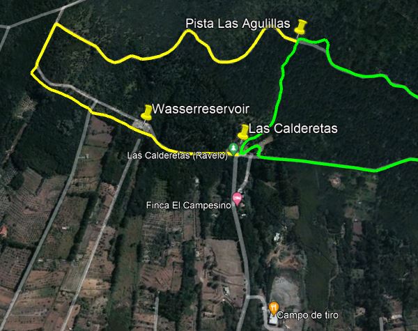 Wer noch eine Runde mehr gehen will, beginnt am Picknickplatz Las Calderatas auf der Piste nach links, die leicht ansteigt. Am Wasserreservoir von Ravelo geht man direkt am Zaun entlang auf dem gelb-weiß markierten Wanderweg. Er verläuft parallel zur Pista Las Calderetas. Dort, wo diese nach oben abbiegt, folgt man ihr für 100m und biegt dann nach rechts auf die Pista Las Aguilillas ab. Von dort wie oben beschrieben weiter. Zusätzlich etwa 1,3 km, siehe Karte, gelb.