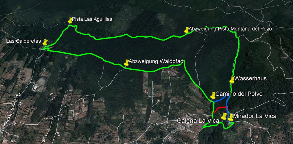 Variante 2 (blau): Zurück und wieder auf dem Herweg in den Wald, bis kurz vor dem Wasserhaus der Camino del Polvo in einem Linksbogen sanft ansteigt.