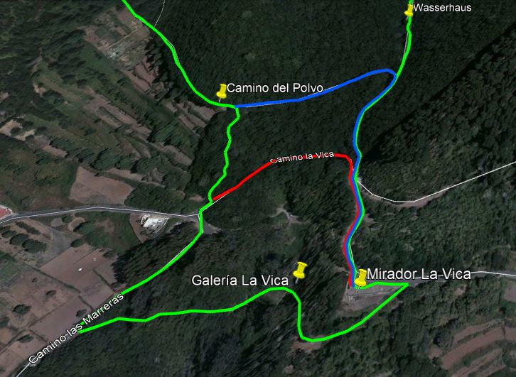 Die Piste ist Teil des Fernwanderwegs, der durch die ganze Insel bis nach Arona verläuft und mit roten Schildern ausgezeichnet ist. Ein solches rotes Schild darf man nach einer scharfen Linkskurve nicht übersehen. Es weist nach rechts, nach La Vica, 1km. Daneben steht noch ein Wegweiser nach Los Nateros. Hier beginnt ein herrlicher Wanderpfad, der durch dichten Baumheidewald abwärts verläuft. Etwas weiter unten gibt es noch einmal eine mit gelb-weißer Markierung bezeichnete Stelle, wo man zwischen Steinen links abbiegen muss. Der Weg ist dann etwas steiler und teilweise mit bemoosten Steinen eingefasst.