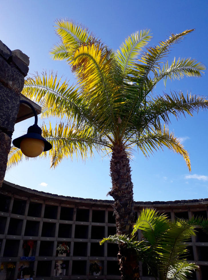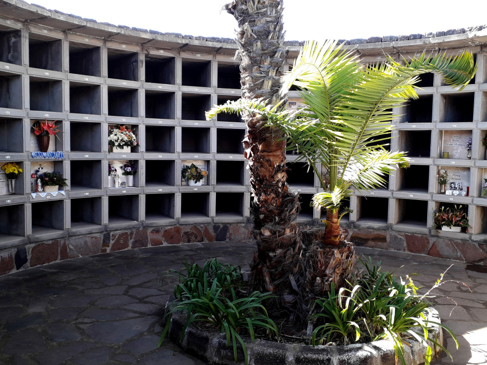 Vielleicht ist er einer der schönsten. Sicher einer der modernsten. Hübsch gestaltet ist er auf jeden Fall. Nirgendwo gibt es einen Friedhof mit besserer Aussicht als in La Guancha. Palmen, den Blick zum Teide und über das Meer, die Verstorbenen können das nicht mehr sehen, aber über so ein Ambiente freuen sich die Angehörigen der Toten.