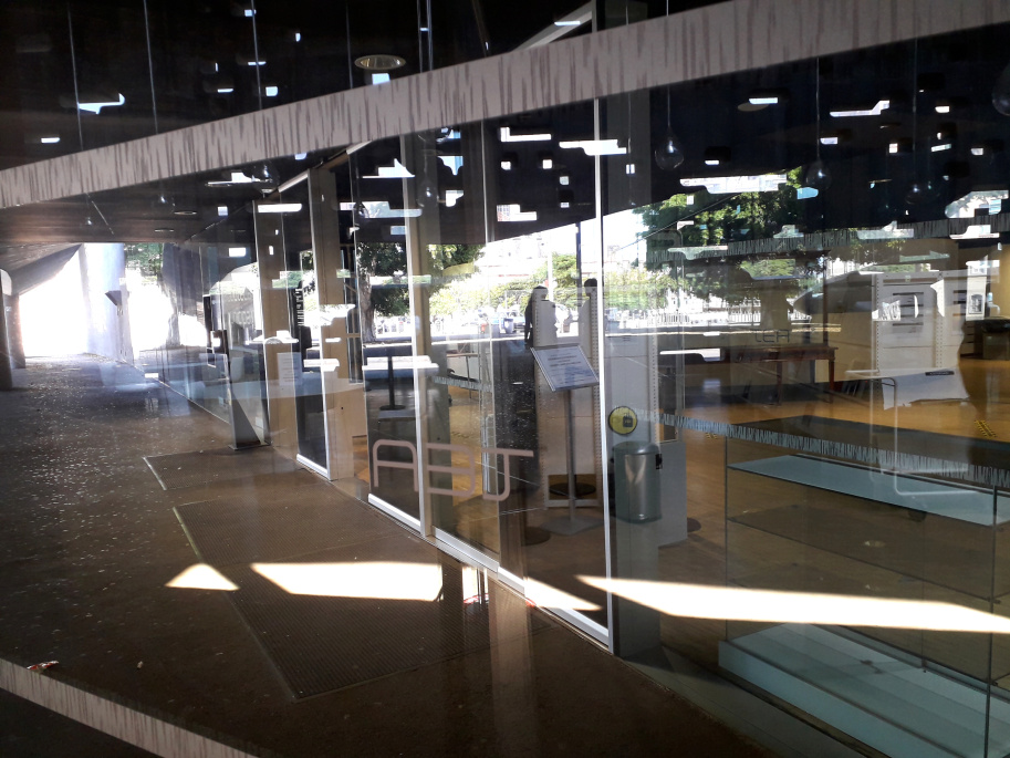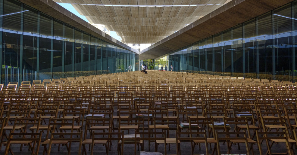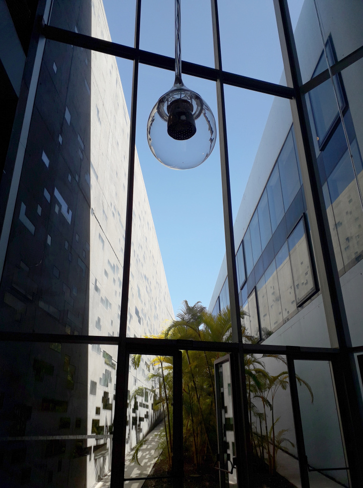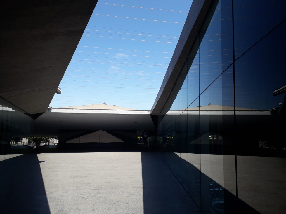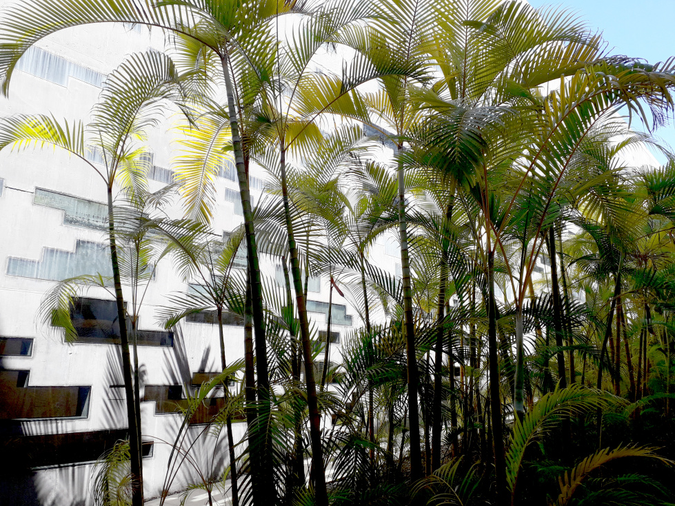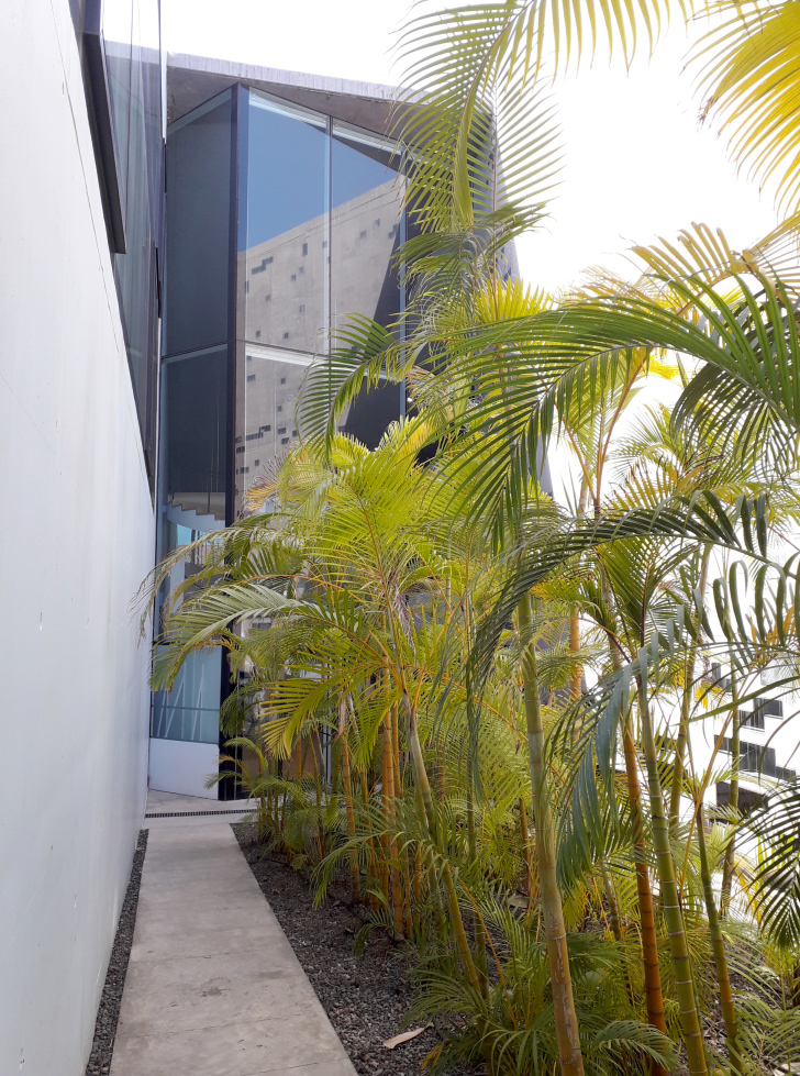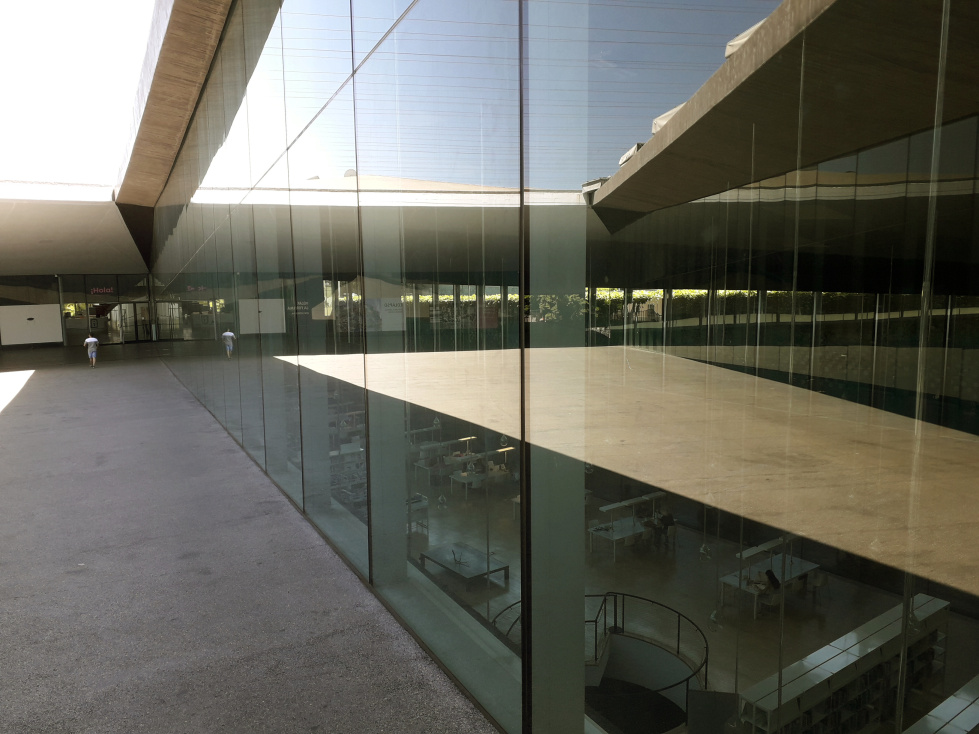 Das Gebäude selbst ist von bestechender Eleganz. Schräge Linien und viele Glasflächen bringen überraschende Lichtreflexionen. Die Sichtbetonwände sind aufgelockert durch tausende kleiner Pixel-Fensterchen, die schon alleine ein Kunstwerk darstellen. Lichtflecken fallen herein, und der Blick geht hinaus in die Stadt, verkleinert zu Miniaturen. Ein schmaler Gang mit Palmen bringt einen grünen Klecks zwischen die Betonwände.