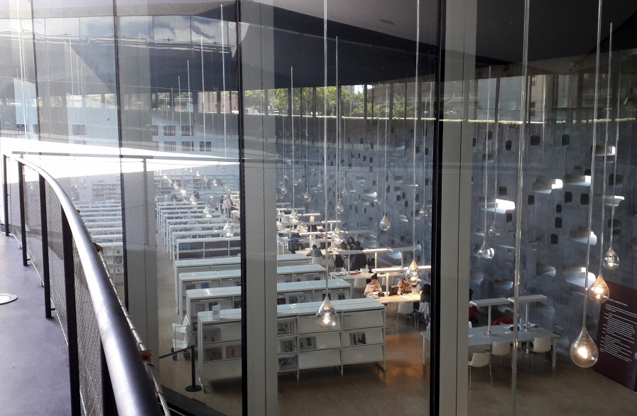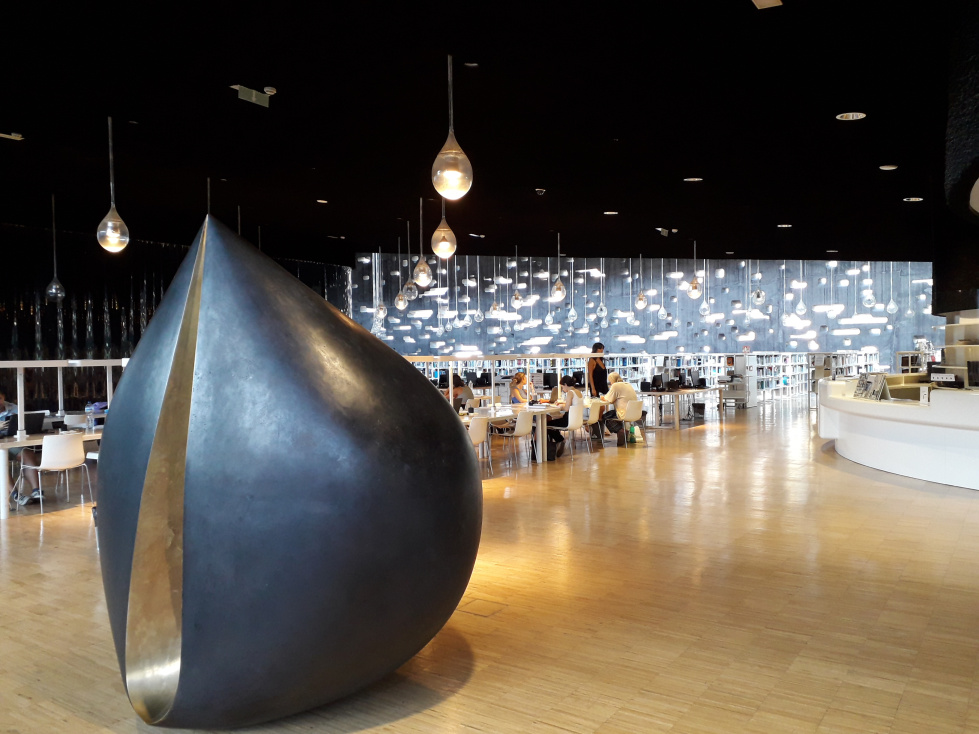 Auch die städtische Bibliothek ist ein besonderes Schmuckstück. Nicht nur weil zwischen den Regalen und Lesetischen Kunstwerke stehen. Auch die Räume selbst sind Kunst, weiträumig und hoch, mit viel Glasflächen und raffinierter Beleuchtung.