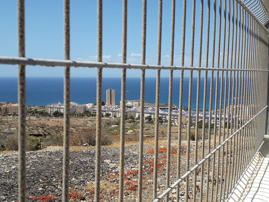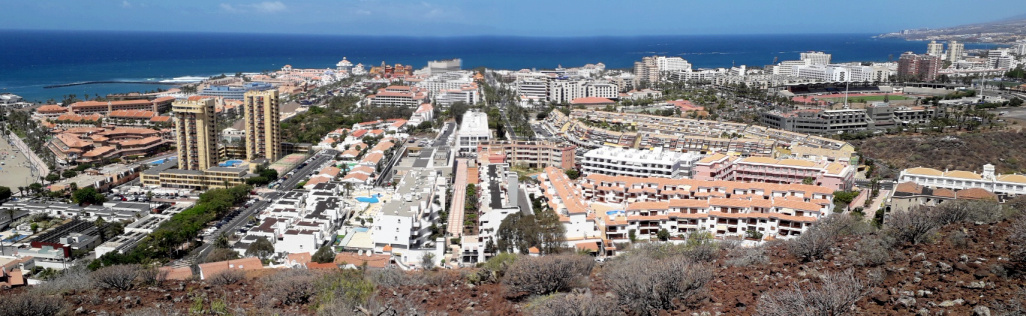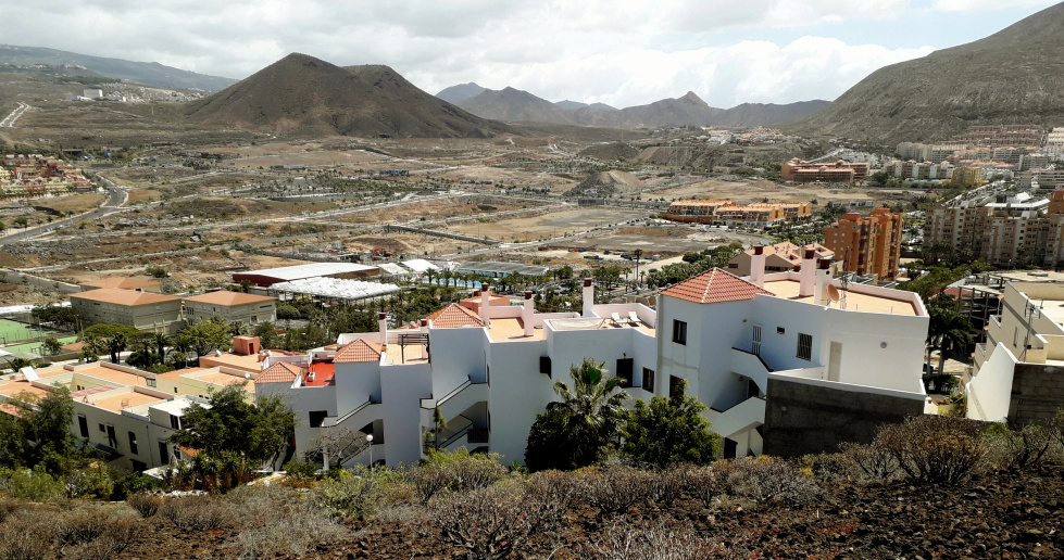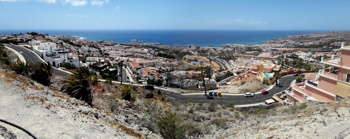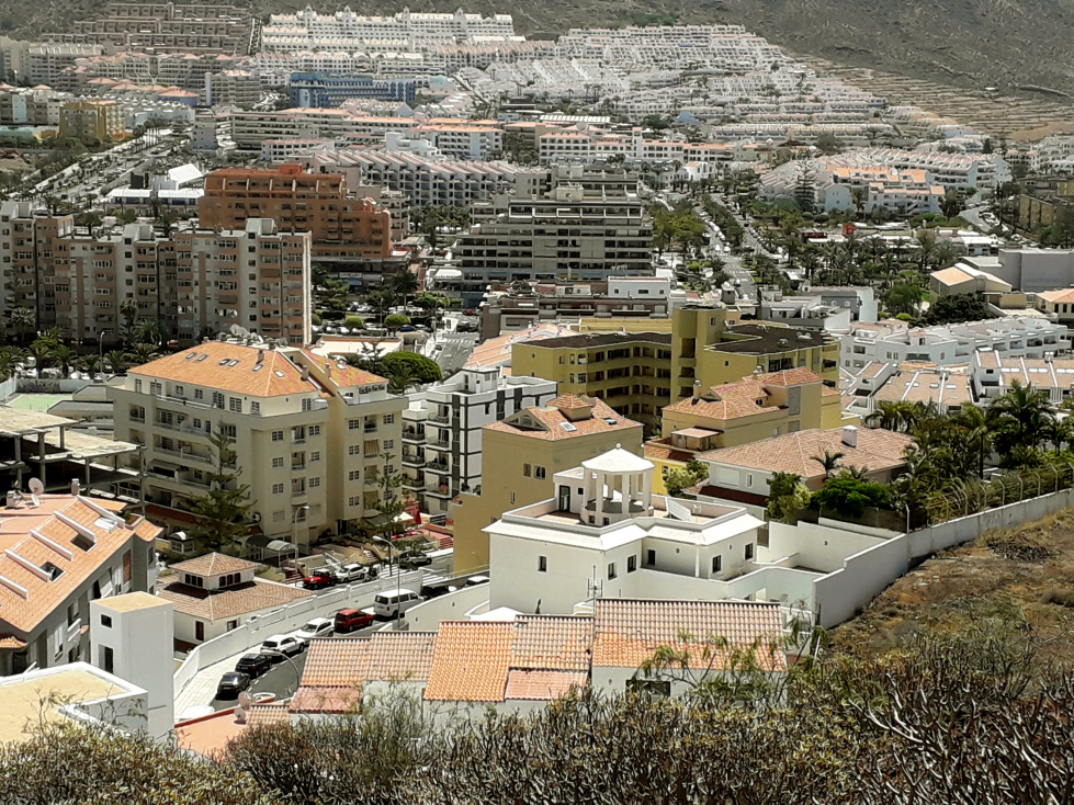 Fährt man auf der TF-655 ein Stück weiter hinauf, kommt man links davon zu einem Hügel mit ein paar etwas luxuriöseren Villen. Doch der Ausblick ist traurig. Trockene, steinige, unbebaute Grundstücke im Vordergrund, dahinter die Stadt bis zum Horizont. Dass sich diese Stadt noch ein ganzes Stück weiter an der Küste entlang zieht, kann man schon nicht mehr erkennen. Los Cristianos und Las Américas gehen nahtlos über in Costa Adeje, wo sich die ach so beliebten Strände befinden (z.B. der Monkey Beach).