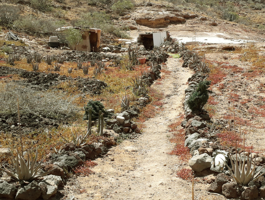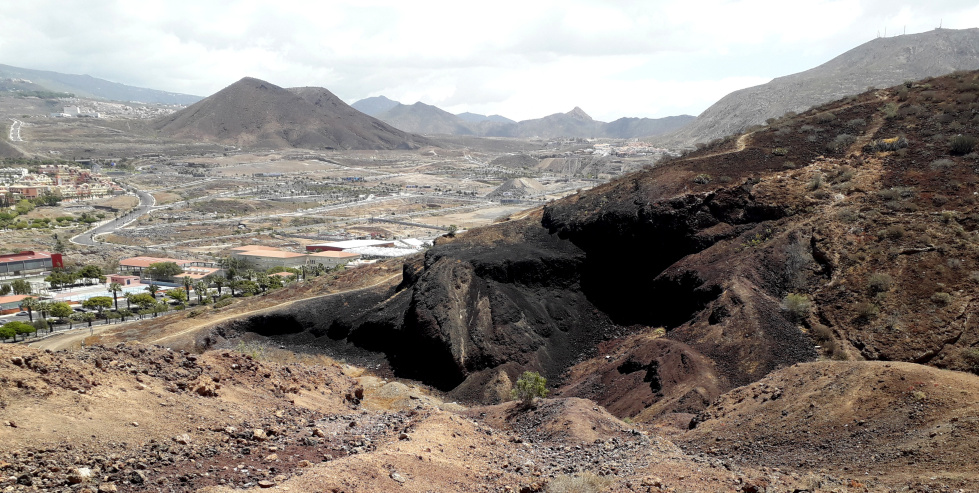 Von der Bergspitze in 113m Höhe sieht man direkt hinunter zum Hafen. Auf dem weiteren Rundweg um den Vulkankrater sieht man dann nach Westen in Richtung Las Américas. Der Abstieg geht in einigen Kurven steil hinunter in der Krater, wo sich ein „Aussteiger“ eine primitive Unterkunft eingerichtet hat. Danach kommt man wieder zu der Piste.