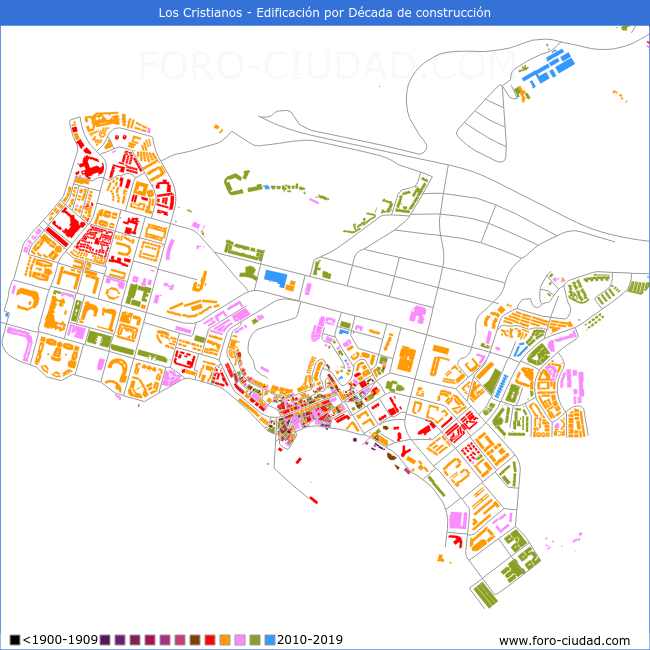 Ab Anfang der 80er Jahre veränderte sich die Landschaft, Straßen wurden angelegt, es entstanden immer mehr Hotels und Apartmenthäuser. Entscheidend war die Eröffnung des Flughafens Teneriffa-Süd im Jahr 1978. Auf dieser Karte sieht man gut, dass ein Großteil der Bebauung von 1980 bis 1989 (orange) und 1990 bis 1999 (rosa) entstanden ist.