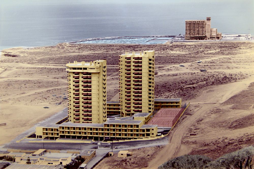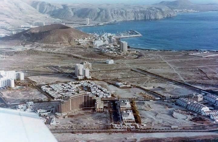 Dann dehnte sich das Stadtgebiet nach Norden aus in die Gegend, die heute Playa de las Américas heißt. Dort wurden die Torres del Sol gebaut, die auch heute noch die Silhouette der Stadt überragen. Ein Stück weiter nördlich entstanden die Hotels Mediterranean Palace und Conquistador. Dazwischen gab es lange Zeit nur trockene Wüstenlandschaft, wie man auf den Bildern von 1983 sieht.