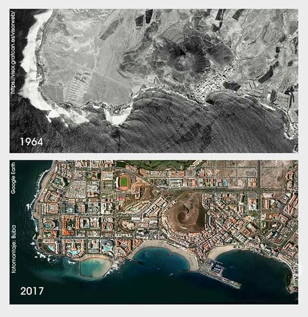 Spätestens hier stellt sich die Frage, was wohl schöner ist. Die unfruchtbare Wüstenlandschaft von früher oder die pulsierende Stadtlandschaft von heute, eines der größten Touristenzentren der Kanaren, gnadenlos vermarktet und verbaut.