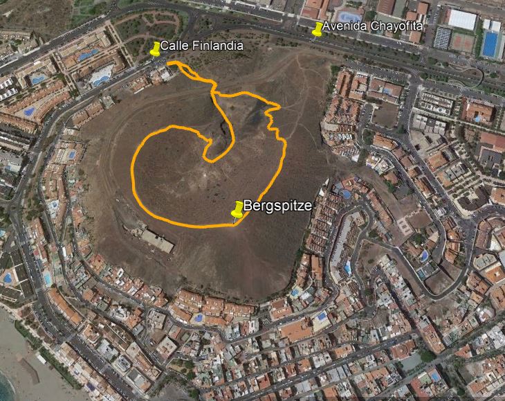 Am besten beginnt man in der Calle Finlandia. Gleich neben dem Free Motion Bikecenter kann man den Aufstieg beginnen. Dort geht man auf einem Trampelpfad schräg bergauf und erreicht nach etwa 100m eine breitere Piste, die man überquert. Man hält sich zuerst links, vorbei an der schwarzen Felswand, dann geht es in einem weiten Rechtsbogen etwas steiler bergauf. Zunächst hat man einen Ausblick nach Osten.