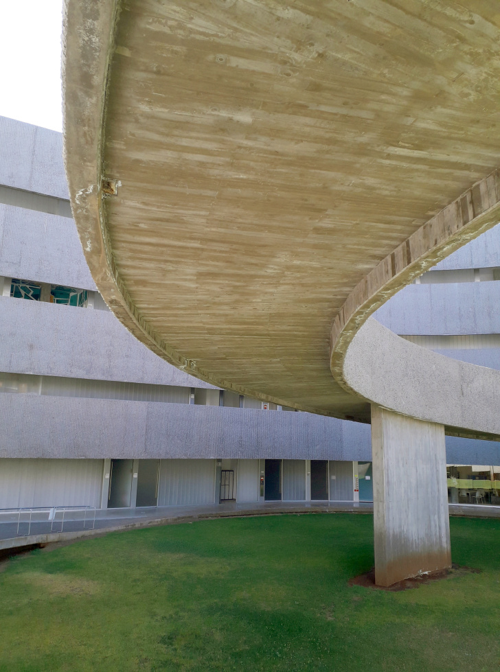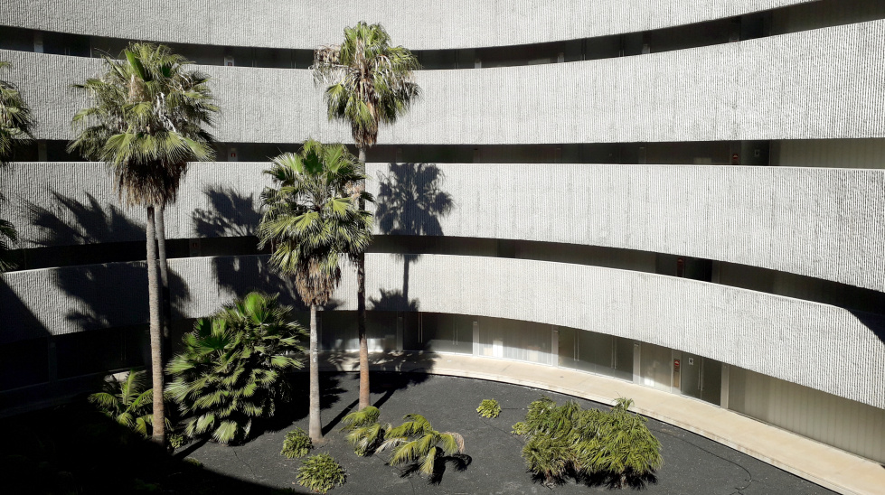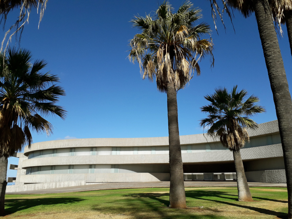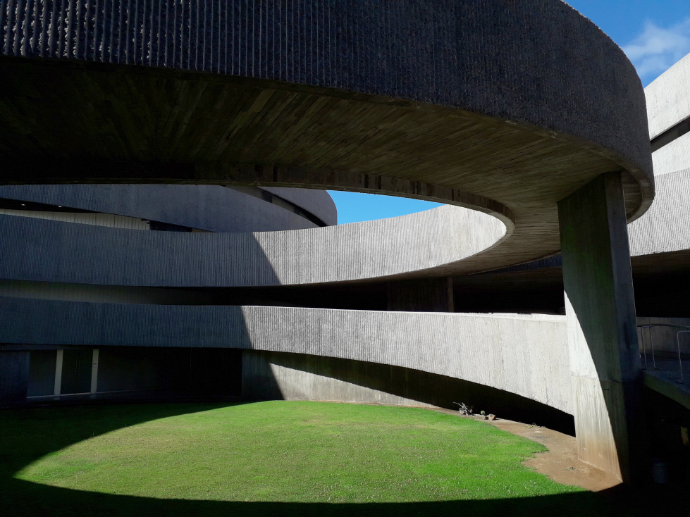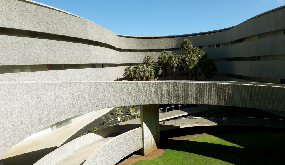 Dort ist alles rund. Es ist kein Kreis, keine Schleife und keine Acht, es ist unregelmäßig rund, verwirrend zunächst, weil es keine Ecken als Orientierung bietet. Gleichförmige Beton- und Glasflächen, außen und innen, wirken beängstigend grau. Als Kontrast zum erschreckenden Grau wachsen in den Innenhöfen Palmen und Kakteen. Auf den umlaufenden, nach innen offenen Gängen geht man in jedem Stockwerk in eine Endlosschleife. Spiralförmige Rampen verbinden die verschiedenen Ebenen.