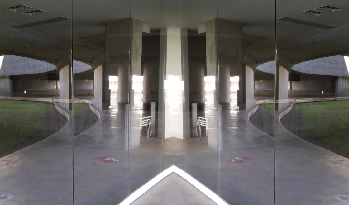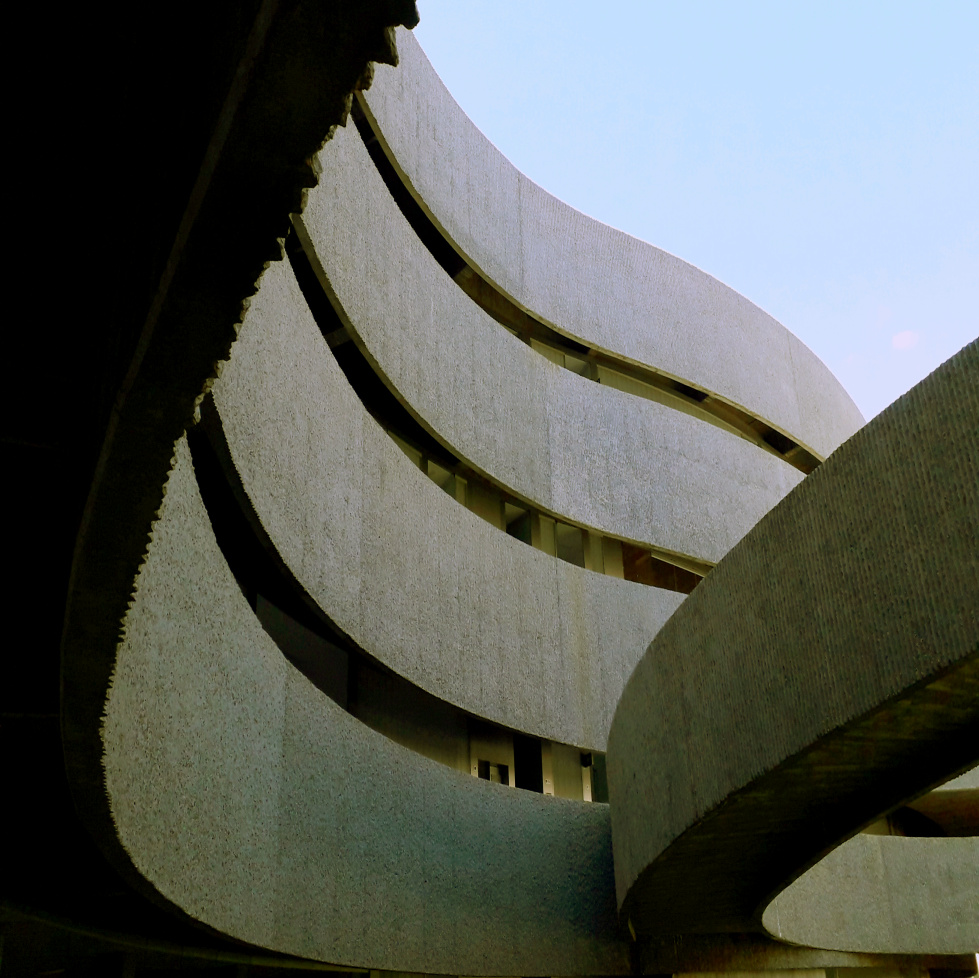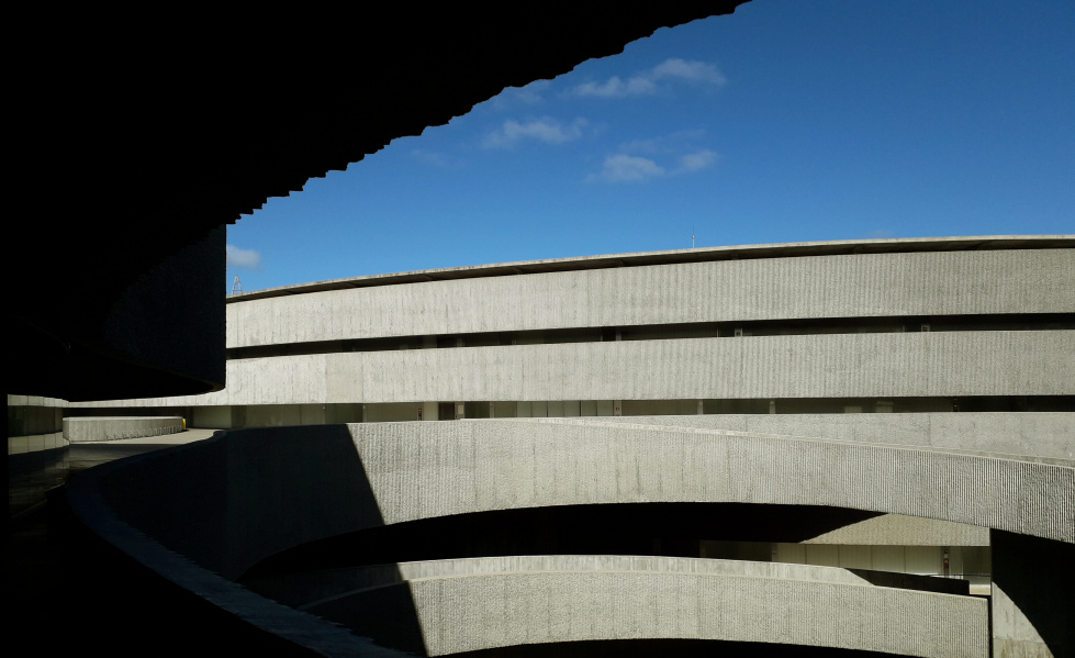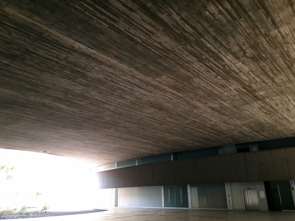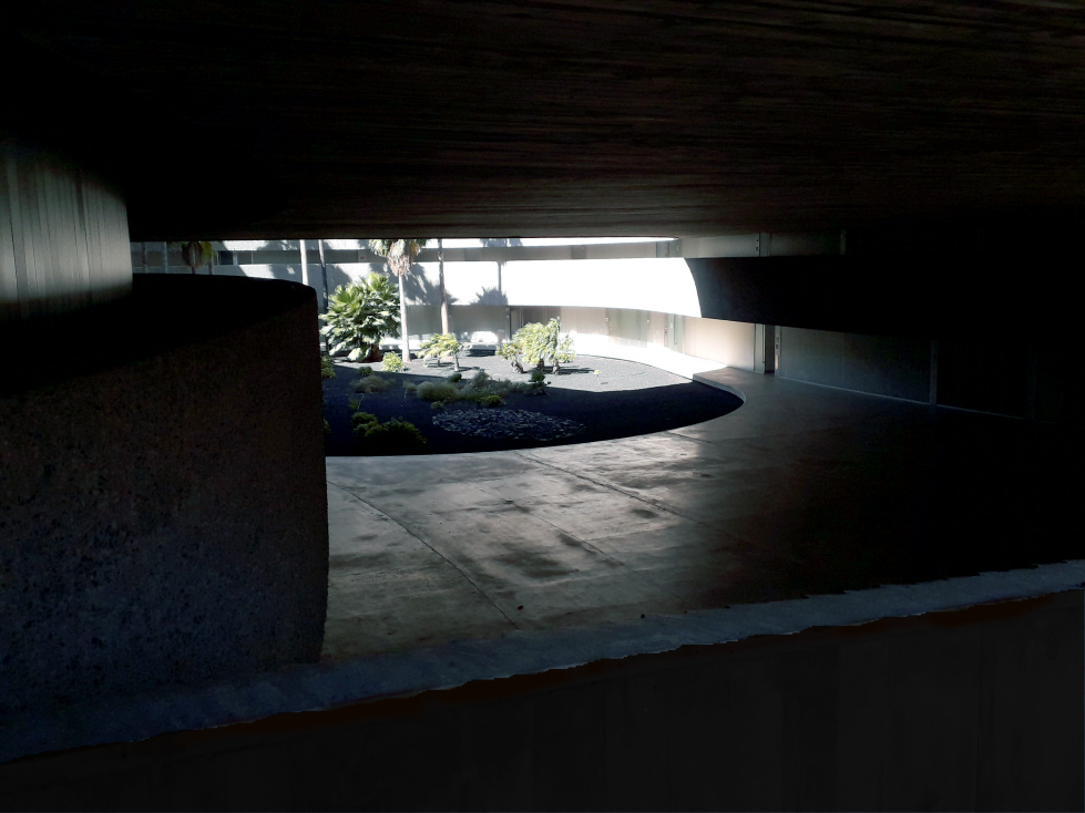 Dort ist alles rund. Es ist kein Kreis, keine Schleife und keine Acht, es ist unregelmäßig rund, verwirrend zunächst, weil es keine Ecken als Orientierung bietet. Gleichförmige Beton- und Glasflächen, außen und innen, wirken beängstigend grau. Als Kontrast zum erschreckenden Grau wachsen in den Innenhöfen Palmen und Kakteen. Auf den umlaufenden, nach innen offenen Gängen geht man in jedem Stockwerk in eine Endlosschleife. Spiralförmige Rampen verbinden die verschiedenen Ebenen.