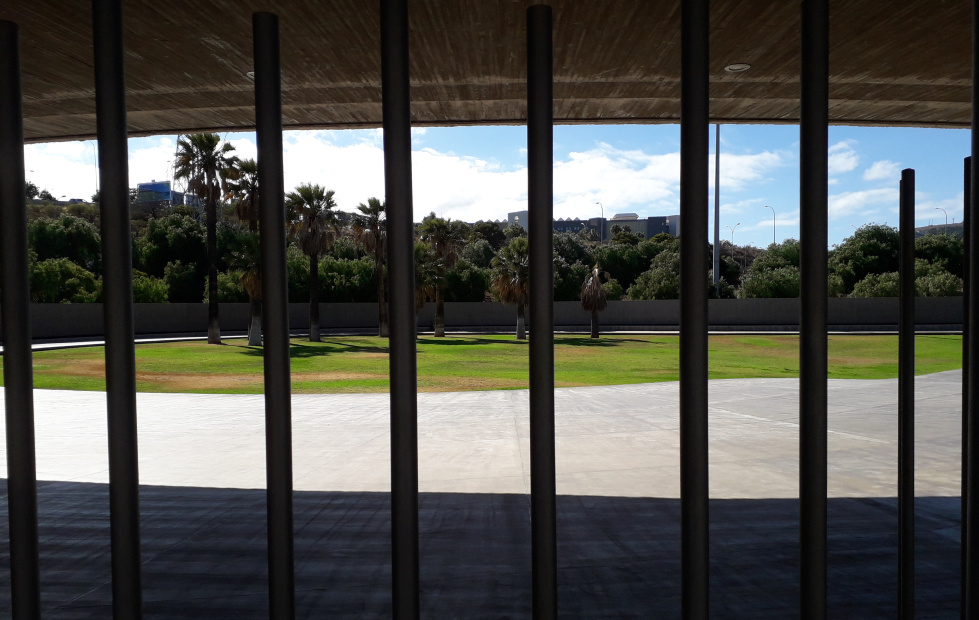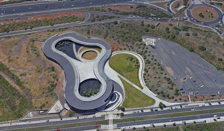 „Das Gebäude materialisiert sich als die umhüllende Spur einer inneren Leere und definiert einen intimen Campus, der die Landschaft der neuen Fakultät gestaltet.“ So liest es sich in der Präsentation der Gruppe GYP Arquitectos, die das Projekt im Auftrag der Universität entworfen hat. Die größte Herausforderung für die Architekten bestand darin, eine harmonische Beziehung zwischen dem neuen Gebäude und seiner Umgebung herzustellen und die Synergie zwischen dem akademischen Viertel und dem heterogenen städtischen Umfeld zu erhöhen. Zwischen der Autobahn und einer langweiligen Ausfallstraße fällt der Gebäudekomplex in dem sonst unbebauten Gelände besonders auf. Er ist die größte Erweiterung des Campus Guajara und wird seit 2014 genutzt. Betonierte Wege leiten von der Calle Radio Aficionados in weiten Bögen und um Grünflächen herum zum Haupteingang und ins Innere.