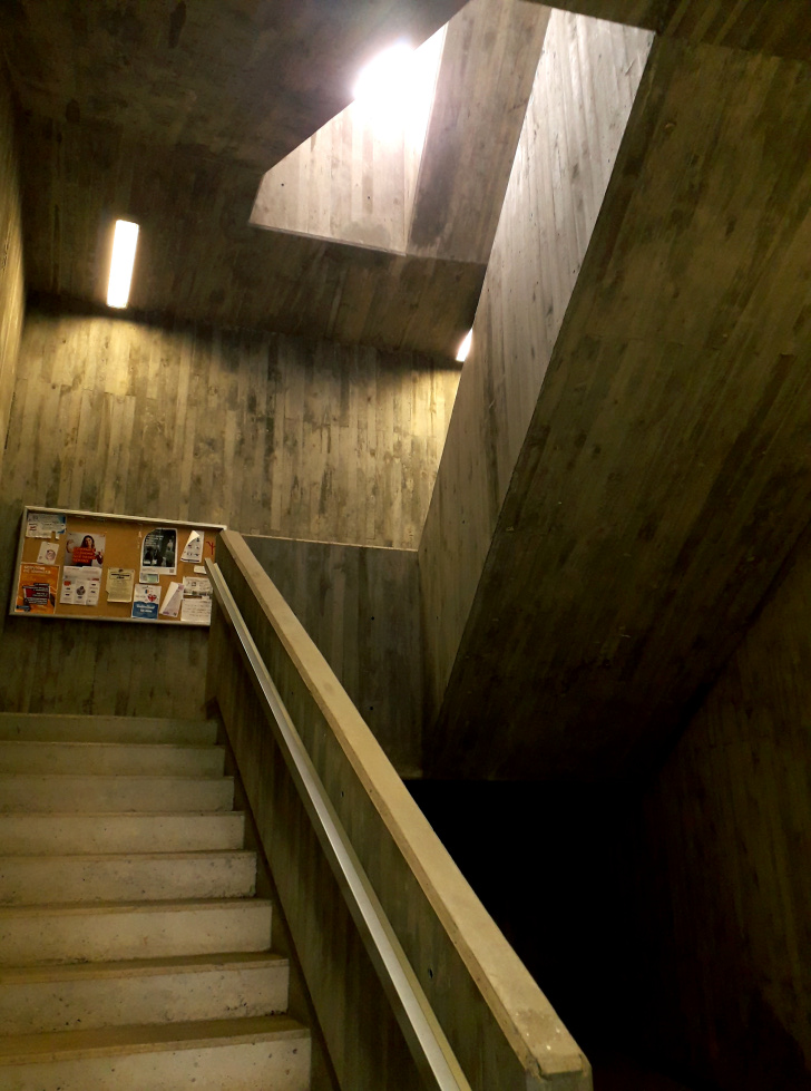 Nirgends gibt es Fenster. Die großen durchscheinenden Flächen aus Milchglas bewirken eine gleichmäßige Verteilung des Lichts und dämpfen Hell-Dunkel-Kontraste, ideal für Gestaltung und Begutachtung von Kunstwerken. Doch es ist befremdlich, verhindert den Blick in die Außenwelt. Das künstlerische Schaffen wird durch Beton und Glas von der Umwelt abgeschnitten.
