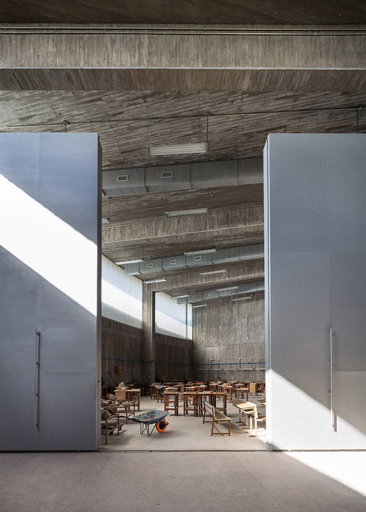 Die Unterrichtsräume, Werkstätten und Labore sind in den geschwungenen Kurven flexibel angeordnet. Die Studienbereiche sind über eine Reihe offener Korridore verteilt und verfügen über bewegliche Wände, die eine flexible Gestaltung der Räume je nach den Bedürfnissen der Studenten ermöglichen. Die begrünten Innenhöfe, die Rampen, die Zugangsterrasse und die darunter liegende große Veranda sind Orte der Begegnung und des Austauschs, offene Unterrichtsräume und Ausstellungsflächen unter freiem Himmel, die die Nutzung des Gebäudes intensivieren.
